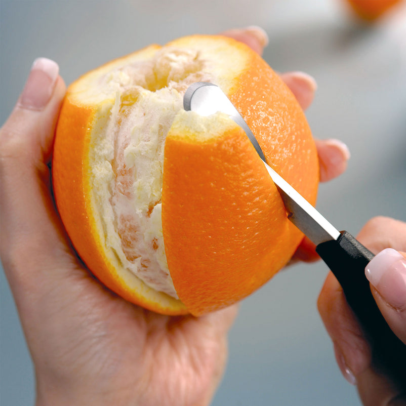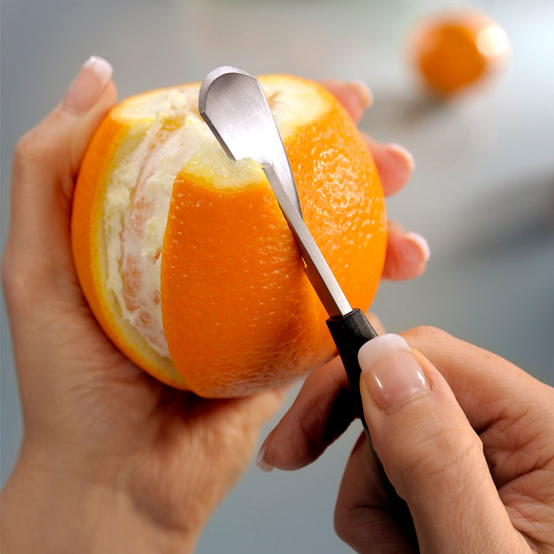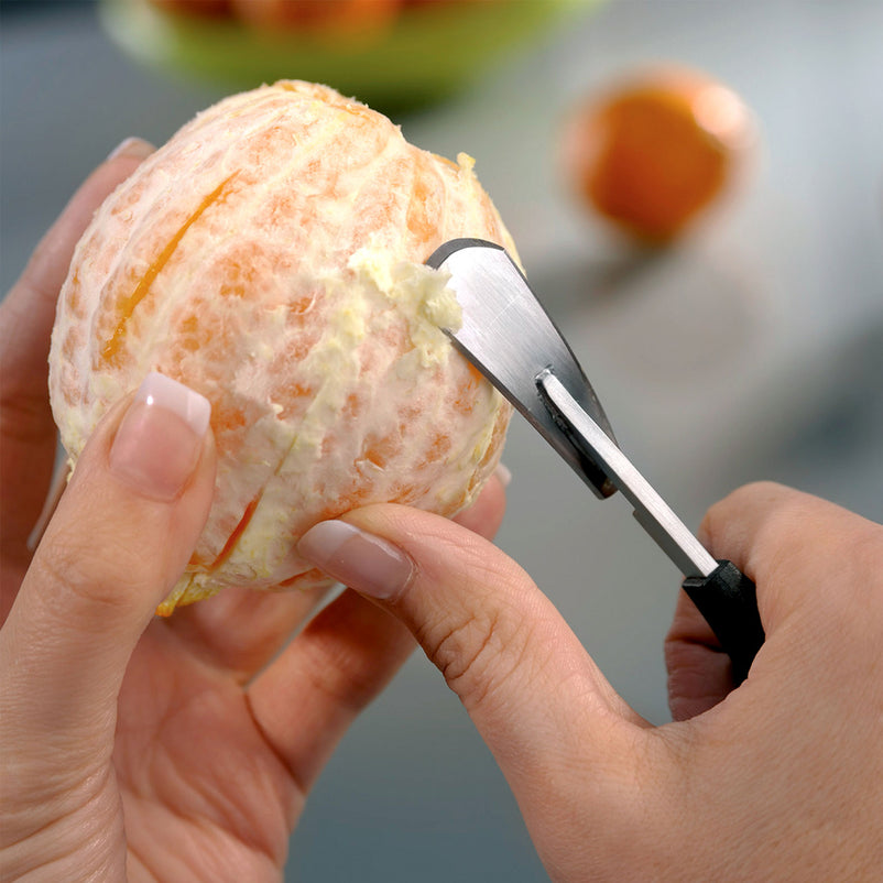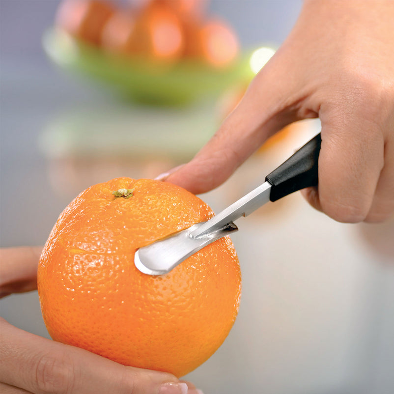 Dispozitiv curățare Melansina. Decojitorul pentru ghimbir și portocale este un instrument eficient pentru îndepărtarea cojii de ghimbir și decojirea portocalelor. Cu o lamă specială, taie ușor coaja fructelor, iar mânerul ergonomic asigură o utilizare confortabilă și precisă. Ideal pentru a elibera aroma fructelor fără a irosi din miezul acestora.