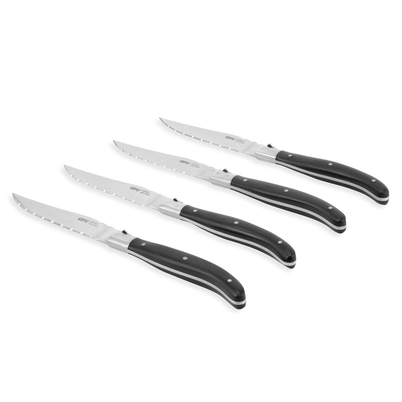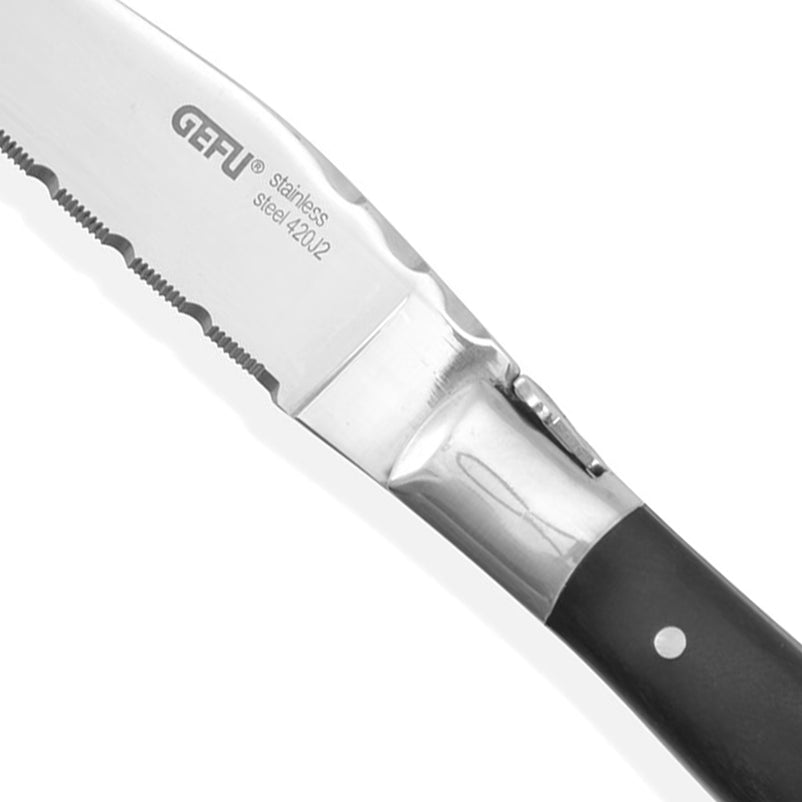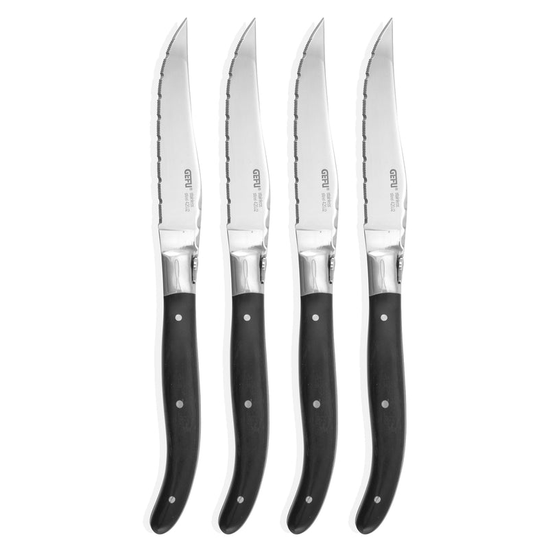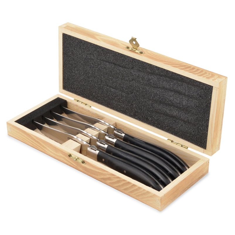 Set 4 cuțite friptură Basco. Set de 4 cuțite pentru friptură într-o cutie elegantă din pin. Lama netedă, ultra-ascuțită, asigură tăierea precisă, iar mânerul din lemn ergonomic, cu nituri din oțel inoxidabil, oferă un confort sporit. Fiecare cuțit este decorat cu un emblemă stilizată a unui cap de taur, adăugând un aspect decorativ.