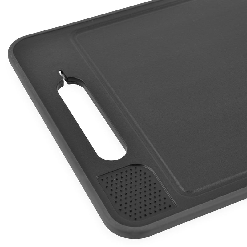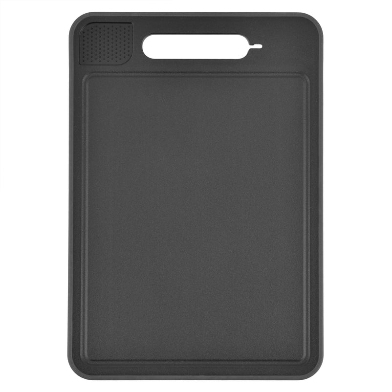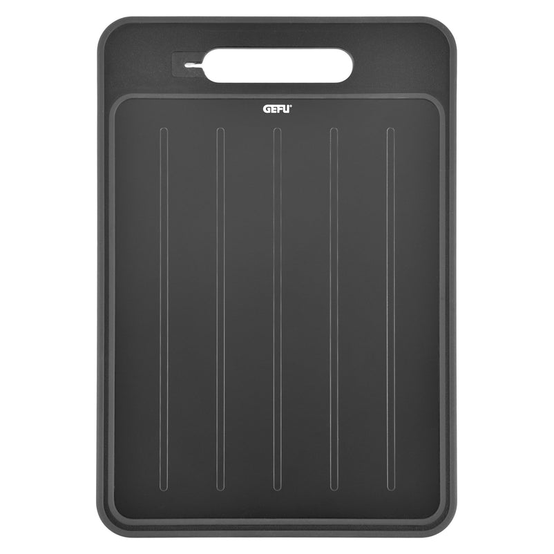 Latura inovatoare de dezghețare, din aluminiu acoperit, nu are niciun impact asupra gustului alimentelor. Partea de tăiere include o groapă continuă pentru a colecta sucurile și o suprafață de râșniță integrată, ideală pentru ghimbir sau coajă de lămâie. Mânerul dispune de un șlefuitor de cuțite integrat, iar marginea de plastic anti-alunecare asigură o utilizare stabilă.