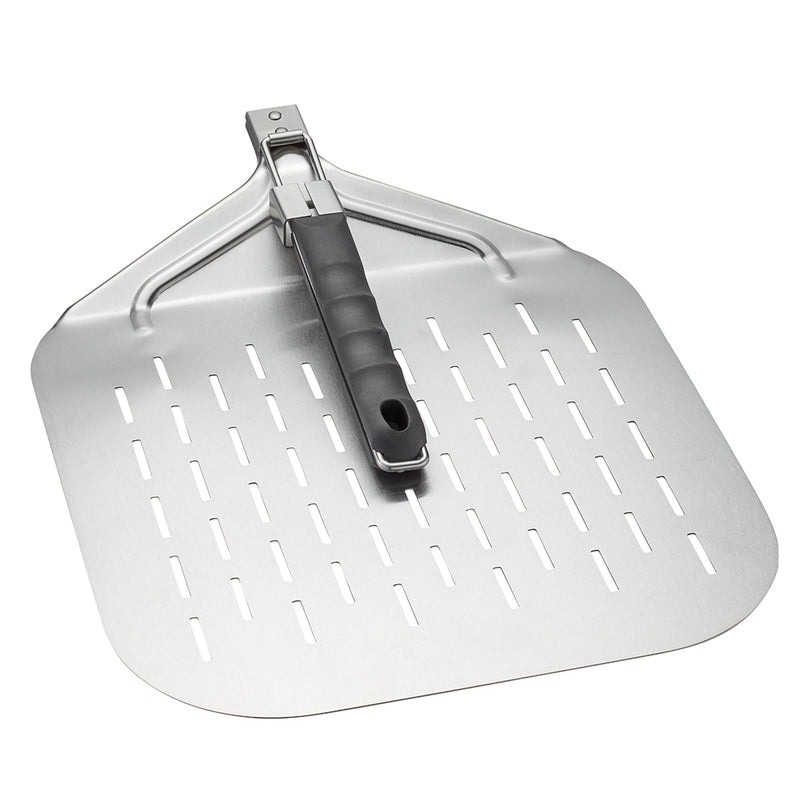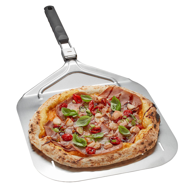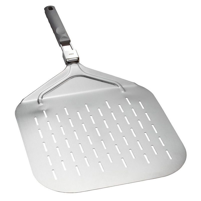 Paletă pentru pizza Slide. Această paletă de pizza are o suprafață netedă și o formă plată, ideală pentru transportarea precisă și ușoară a pizzei. Suprafețele perforate permit aburului să iasă și făina în exces să se desprindă. Mânerul ergonomic pliabil asigură o manipulare sigură și economisirea spațiului la depozitare. Cu o suprafață de contact extra-largă de 32 cm x 32 cm, este potrivită atât pentru grătar, cât și pentru cuptor. Este, de asemenea, perfectă pentru pâine, tarte flambée și prăjituri. Dispune de o buclă pentru suspendare.