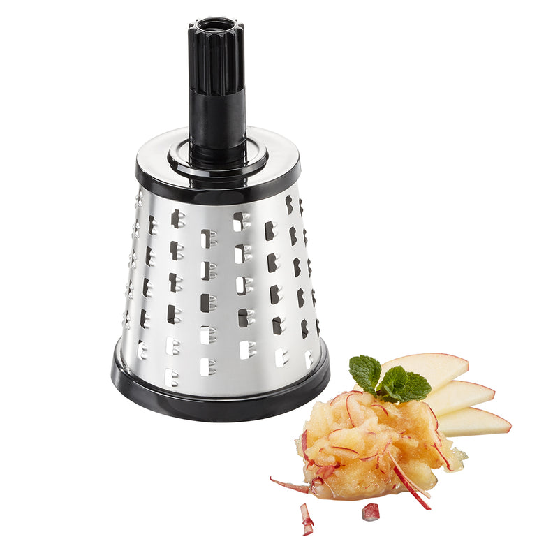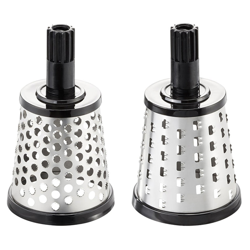 Set 2 răzători Transforma. Tamburii de tăiere Crown/Bircher TRANSFORMA sunt ideali pentru prepararea aluatului de clătite din cartofi, rânduirea brânzeturilor tari și prepararea muesli-ului crud Bircher. Găurile mari și direcțiile opuse asigură tăiere rapidă și eficientă a ingredientelor, inclusiv cartofi pentru rösti.