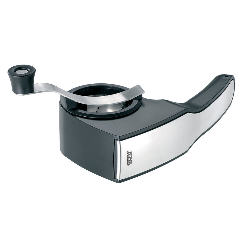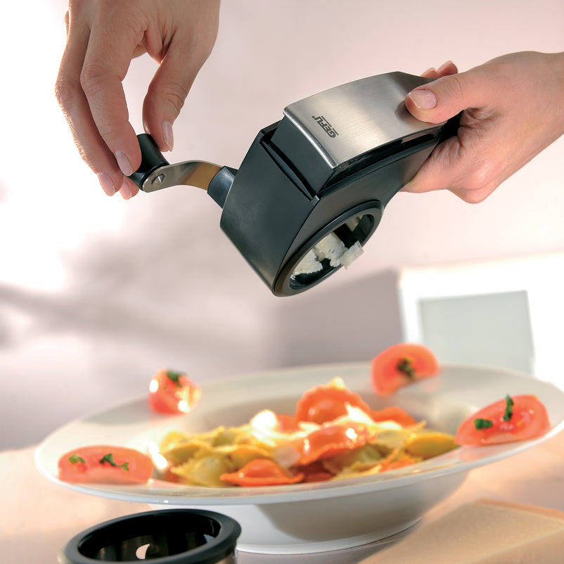 Răzătoare reversibilă, 2 site, container de colectare Pecorino. Dispozitivul Pecorino este perfect atât pentru răzuire, cât şi pentru feliere, iar multifuncţionalitatea sa vă ajută să salvaţi spaţiu în bucătărie. Este realizat din inox şi este foarte rezistent. În plus, conţine două tobe pentru tăiere fină şi groasă, astfel că puteţi tăia brânza tare, nucile sau ciocolata cu uşurinţă. De asemenea, include un container pentru stocare, pentru a păstra mereu ordinea în pragătirea preparatelor. Maneta este versatilă şi poate fi utilizată atât de dreptaci, cât şi de stângaci.