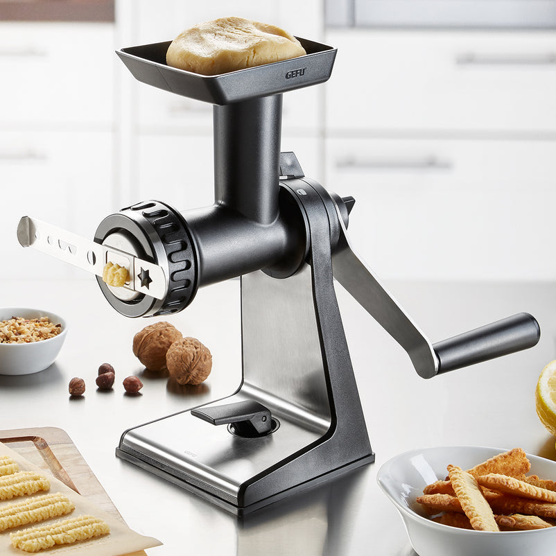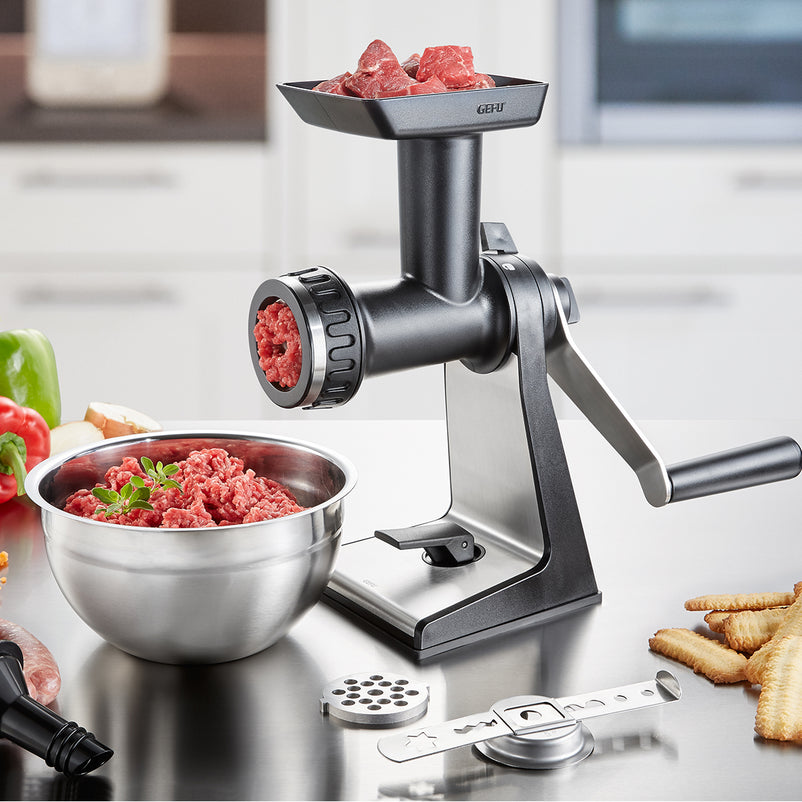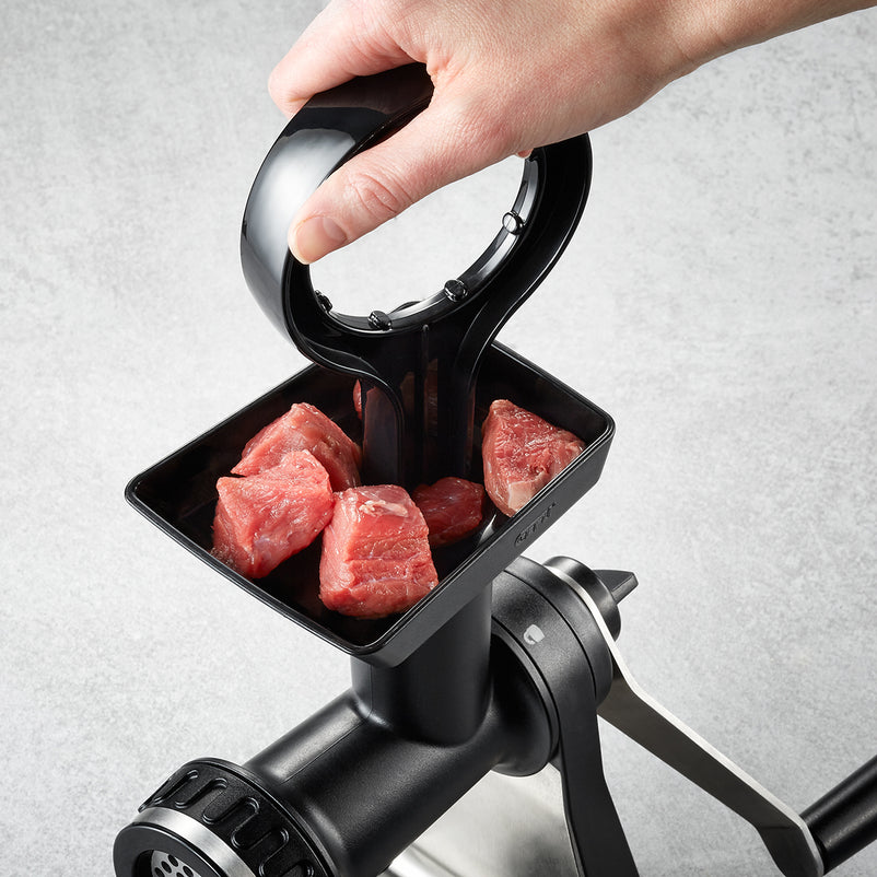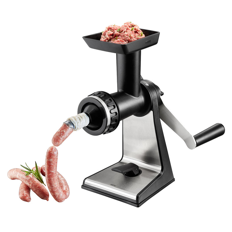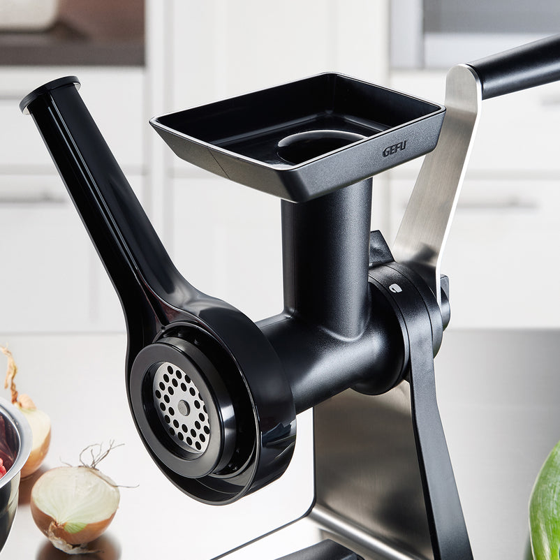 Mașină pentru tocat Transforma.Acest aparat versatil include două plăci de măcinare (grosieră și fină), perfecte pentru procesarea cărnii, peștelui și legumelor. De asemenea, dispune de un umplător de cârnați și un accesoriu pentru fursecuri spritz, cu 5 discuri decorative. Munca este ușoară datorită designului special al șurubului de transport și al filetului interior, iar cuțitul de tocat este auto-ascuțit pentru performanță optimă. În plus, include un apărător/cheie pentru împingerea alimentelor și pentru fixarea/desfacerea piuliței de blocare. Montajul și demontajul sunt simple, datorită sistemului de fixare tip bayonet, iar opțiunea de supliment pentru dispozitivul de ras, adaugă mai multă versatilitate. Baza înaltă permite plasarea bolurilor cu margini înalte dedesubt, iar aparatul este prevăzut cu picior de aspirație și un clește de masă extra-înalt, care se extinde până la 8 cm / 3 in. Toate piesele sunt compatibile cu mașina de spălat vase (cu excepția bazei), facilitând astfel curățarea rapidă și eficientă.