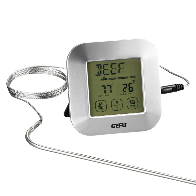 Termometru Punto. Acest termometru este ideal pentru grătar, cuptor și plită, fiind programabil cu temperaturi presetate pentru carne de vită, porc, pește, vițel, pui, curcan, miel și hamburger. Dispune de un ecran tactil și o gamă de măsurare între 0° C și 250° C / 32° F și 482° F. Include un cronometru de până la 99 de minute și 59 de secunde, o funcție de alarmă și un magnet integrat, precum și un suport pentru o utilizare comodă.