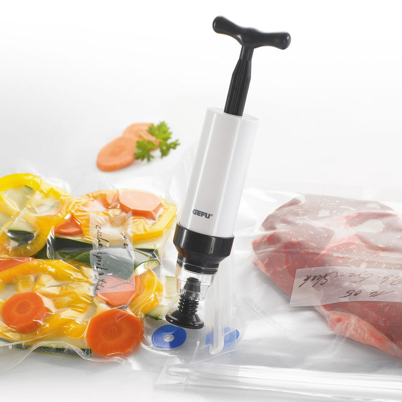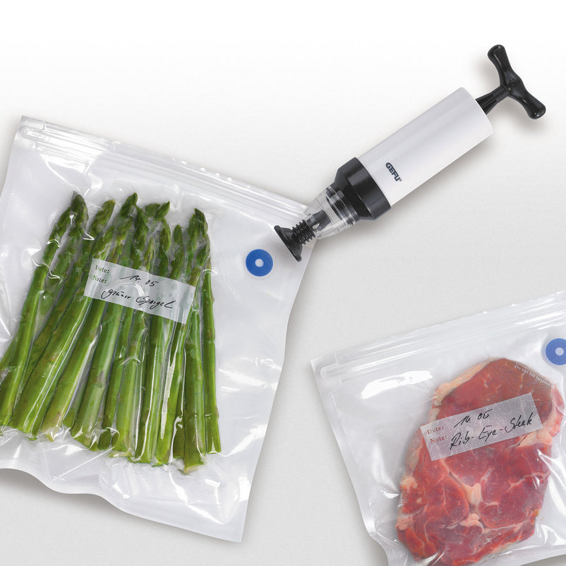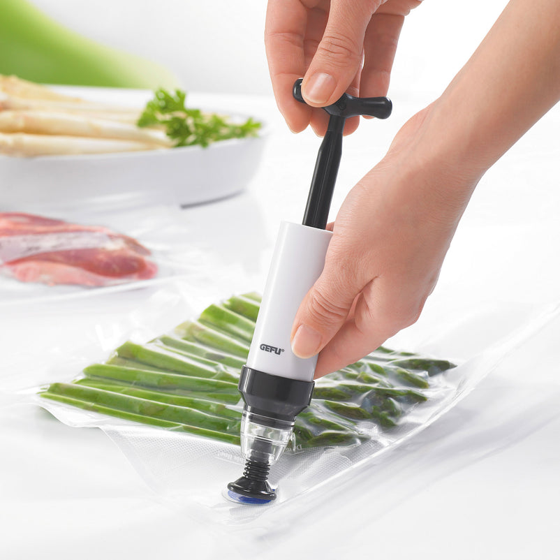 Set vacuum 11 piese Vaco. Setul de sigilare VACO este ideal pentru păstrarea alimentelor proaspete mai mult timp, prelungind durata lor de valabilitate de până la 5 ori. Acesta minimizează arsura de îngheț și păstrează vitaminele și nutrienții. Setul include 5 pungi mici și 5 pungi mari, reutilizabile, și o pompă manuală din plastic ABS. Pungile sunt rezistente la temperaturi între -20°C și +90°C, potrivite pentru gătitul sous-vide, congelare și depozitare. Acestea protejează alimentele de bacterii și umiditate, menținându-le proaspete mai mult timp.