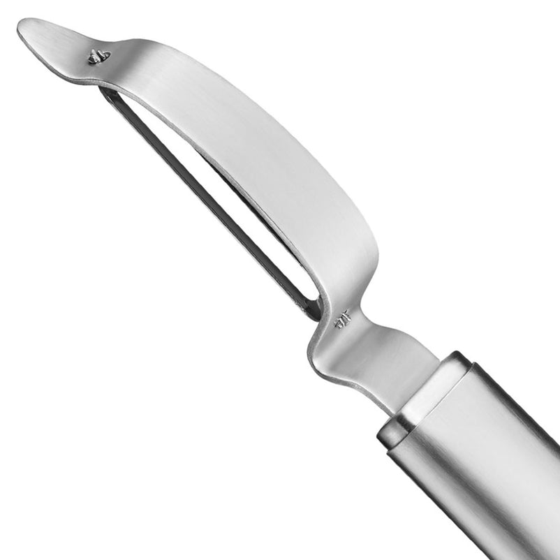 Dispozitiv curățare Primeline. Acest curățător cu lamă pivotantă este ideal atât pentru dreptaci, cât și pentru stângaci, oferind o tăiere precisă și delicată a cojii fructelor și legumelor. Lama dublă asigură o utilizare eficientă, iar mânerul ergonomic permite o prindere confortabilă, reducând semnificativ oboseala în timpul utilizării. În plus, vine echipat cu un capac de protecție, oferind siguranță și durabilitate sporite.
