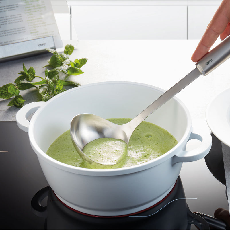 Polonic Primeline. Polonicul din gama Primeline este o ustensilă utilă în bucătăria voastră pentru a pune mâncărurile preferate în farfurie. Realizat din inox și plastic, este rezistent și durabil, și este potrivit pentru a prepara și servi supe şi ciorbe gustoase.