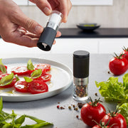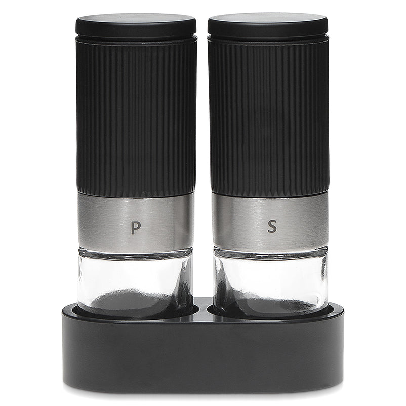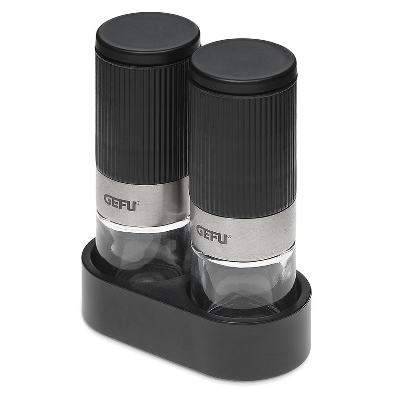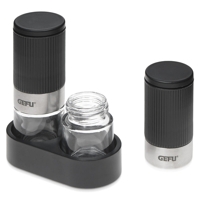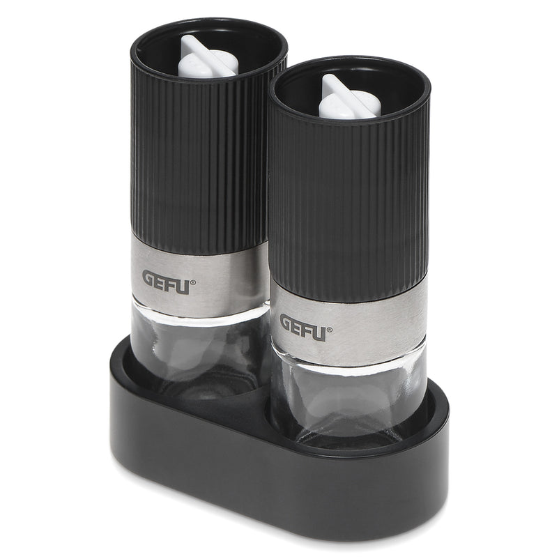 Setul de râșnițe manuale Gefu Tusome este ideal pentru a adăuga un plus de savoare meselor tale. Acest set include două râșnițe compacte, perfecte pentru sare și piper, fiecare având un design elegant din inox de culoare neagră și o înălțime de 9,2 cm. Fiecare râșniță este echipată cu un mecanism de măcinare din ceramică, ajustabil pe trepte, permițând reglarea fină a grosimii măcinării. Capacele cu design special ajută la menținerea prospețimii condimentelor și previn murdărirea suprafețelor. Setul include și un suport practic pentru depozitare.
