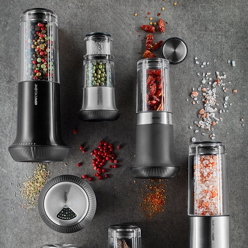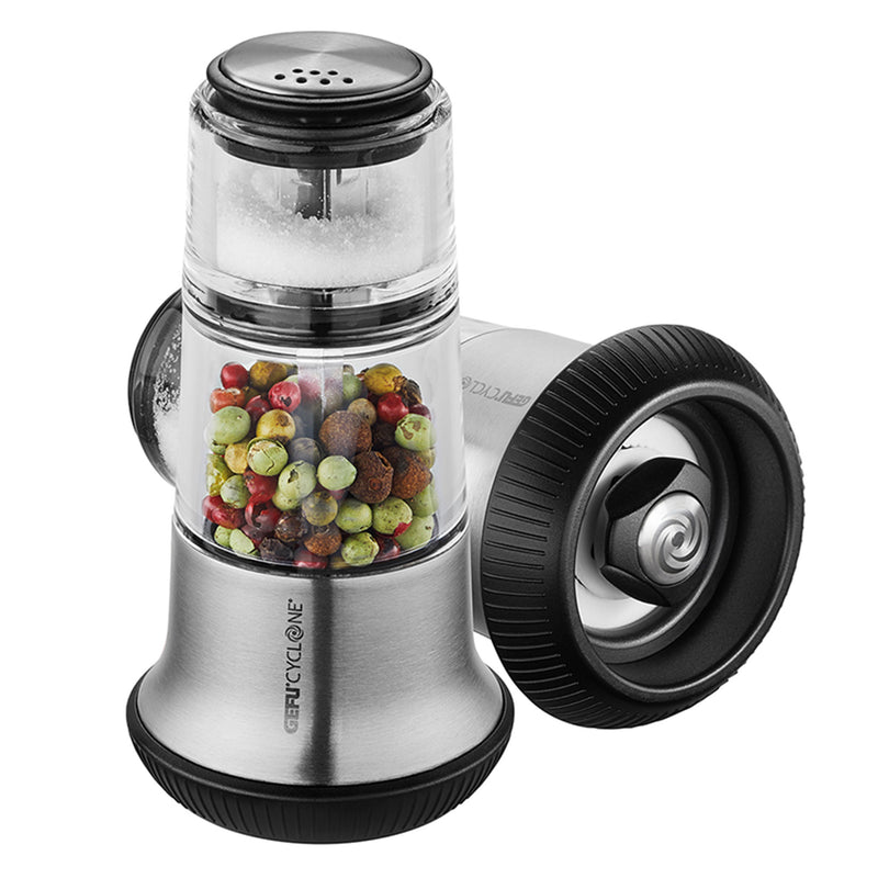 Râșniță piper X-Plosion. Partea superioară se reîncarcă cu sare, iar partea inferioară cu boabe de piper.