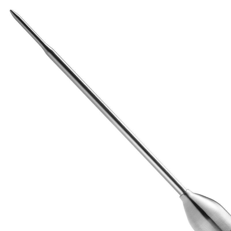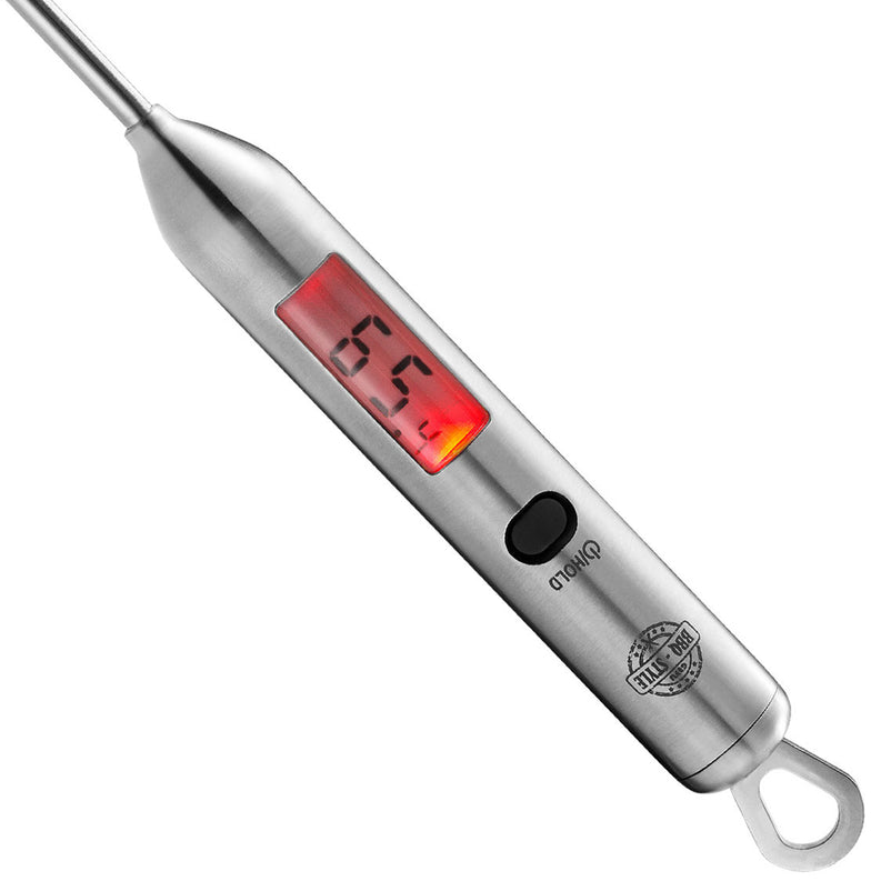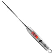 Termometru digital BBQ. Termometru digital cu interval de temperatură -40°C până la 200°C / -40°F până la 392°F. Afișaj în roșu, cu opțiune de temperatură în °C sau °F. Include cârlig pentru agățare și trei baterii LR44. Ideal pentru gătit la grătar, în oală sau cuptor.