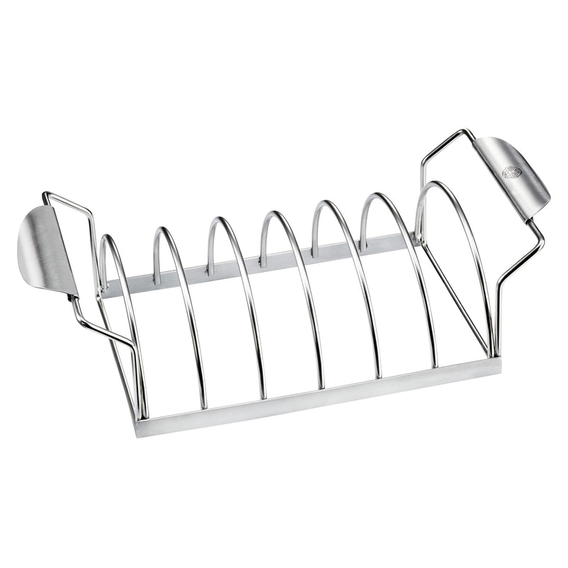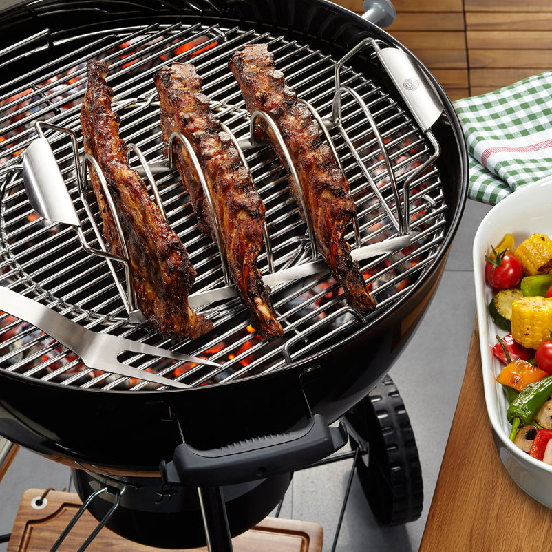 Accesoriu grătar pentru carne BBQ. Acest suport este ideal pentru 6 porții de coaste de porc, fiind perfect și ca suport pentru fripturi. Poate fi utilizat atât pe grătarul cu carbon, cât și în cuptor.