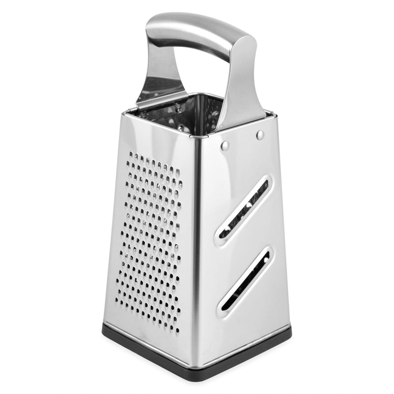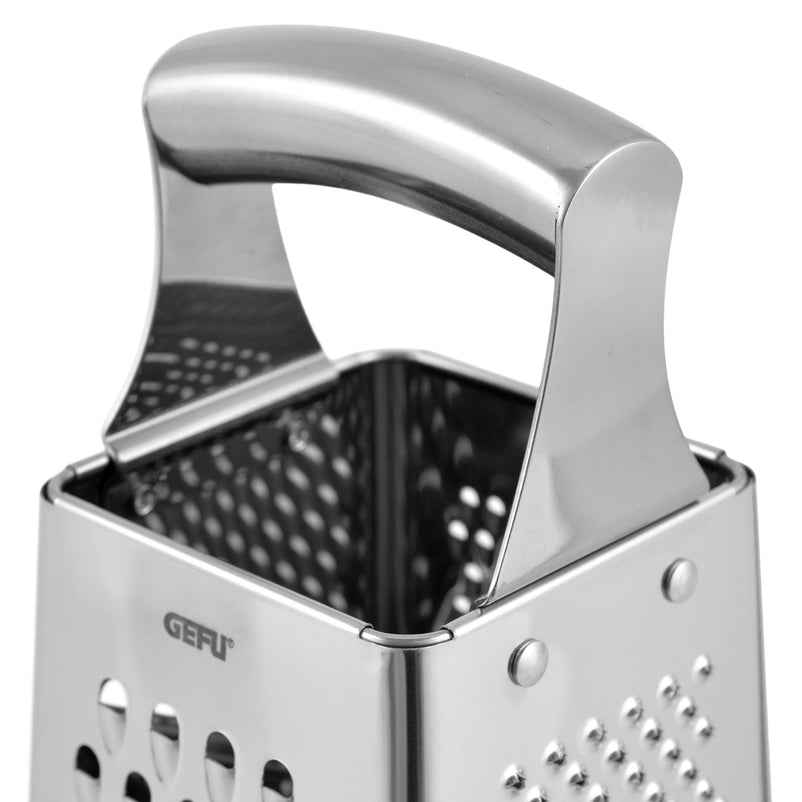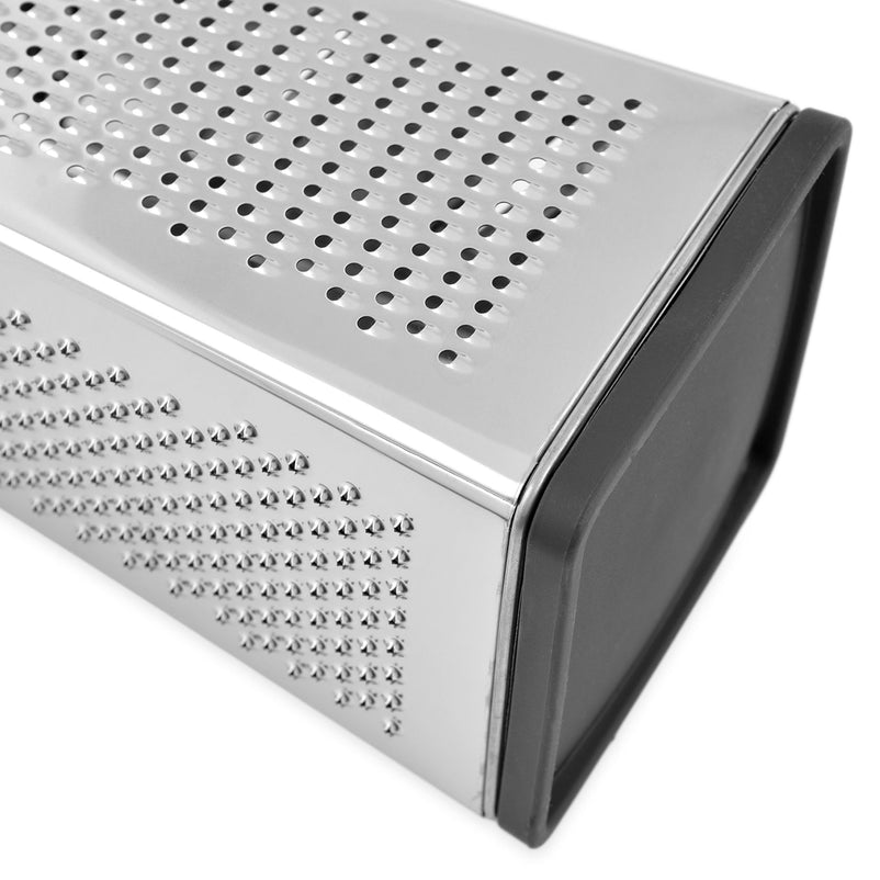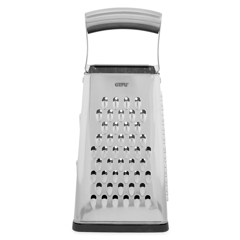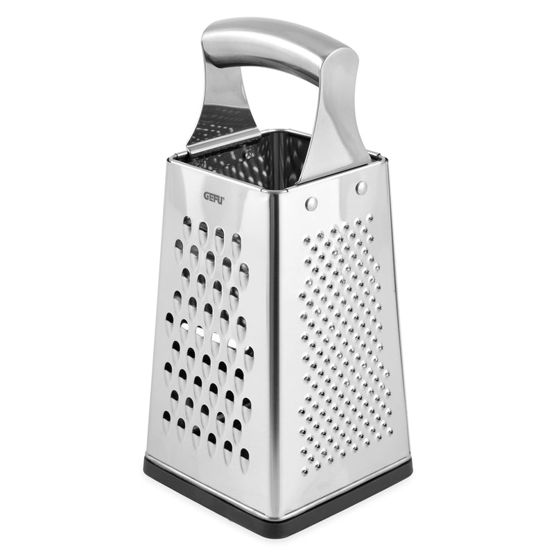 Răzătoare Grato. Răzătoare 4 în 1 din oțel inoxidabil de înaltă calitate, ideală pentru mai multe tipuri de ingrediente. Aceasta include o feliator pentru castraveți și cartofi, o răzătoare mare pentru legume și brânză moale, o răzătoare fină pentru fructe și legume crude și brânză tare, precum și o răzătoare pentru cartofi. Mânerul ergonomic asigură o manipulare sigură, iar capacul de colectare este prevăzut cu funcție antiderapantă pentru o utilizare ușoară.