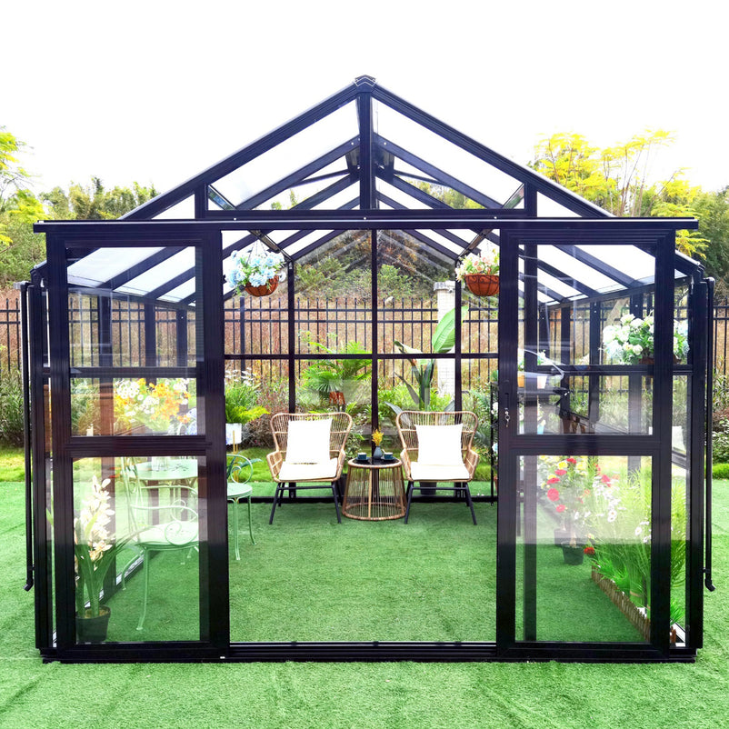 Panourile din sticlă sunt reținute cu grijă cu o garnitură exterioară substanțială, iar marginile policarbonatului sunt complet ascunse. În plus, toate șuruburile și piulițele sunt invizibile pentru acest model. Astfel, acest pavilion/oranjerie arată extrem de îngrijit, elegant și de calitate superioară. Poate fi o soluție excelentă pentru o zonă de agrement în aer liber atunci când spațiul casei tale este limitat.
