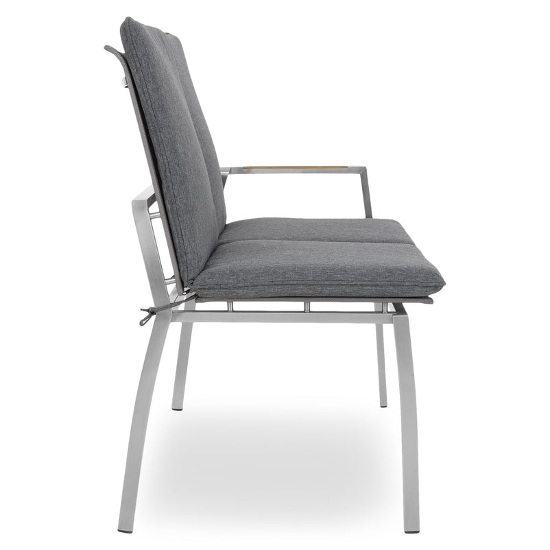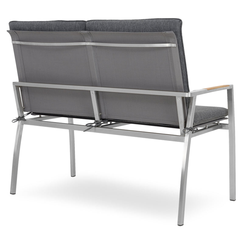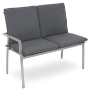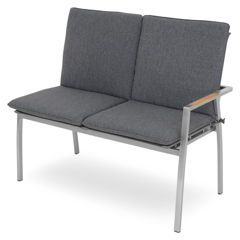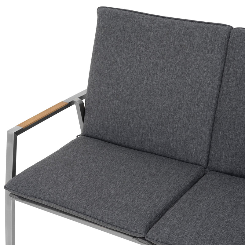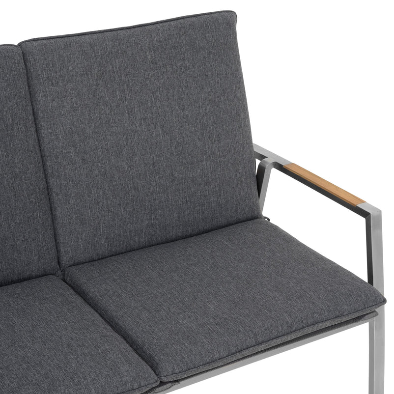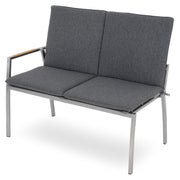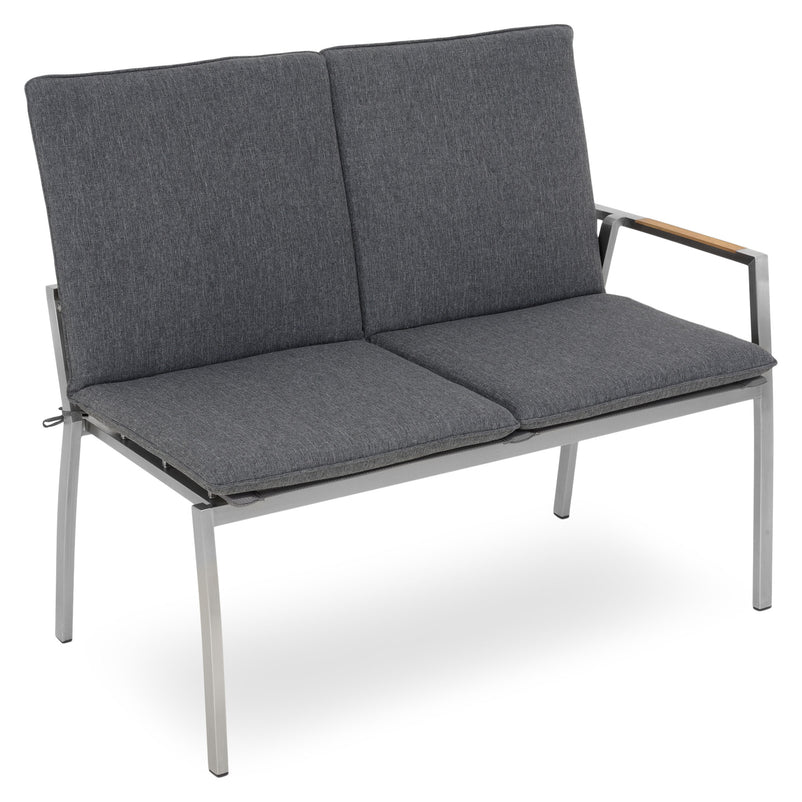 Canapea exterior, 2 locuri braț stânga/dreapta Collodi. Adunați-vă prietenii pe terasa sau grădina de acasă și stați confortabil la un pahar de vin, pe o canapea elegantă din gama Collodi. Realizată din structură de inox, cu șezutul și spătarul din textilină fină 2*1 cu protecție UV, canapeaua include perne din țesătură Olefin cu protecție împotriva umezelii și a decolorării. De asemenea, pe brațele mobilierului sunt inserții din lemn de teak. Simțiți-vă comod în mediul vostru de bine de acasă și insuflați o nouă înfățișare terasei sau grădinii.