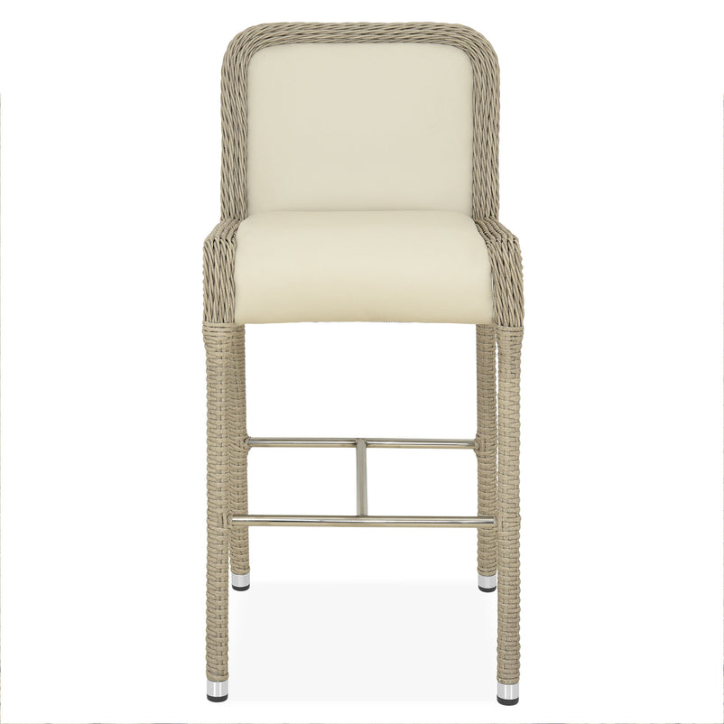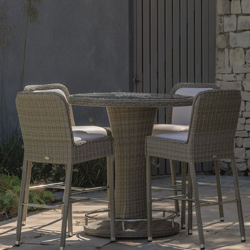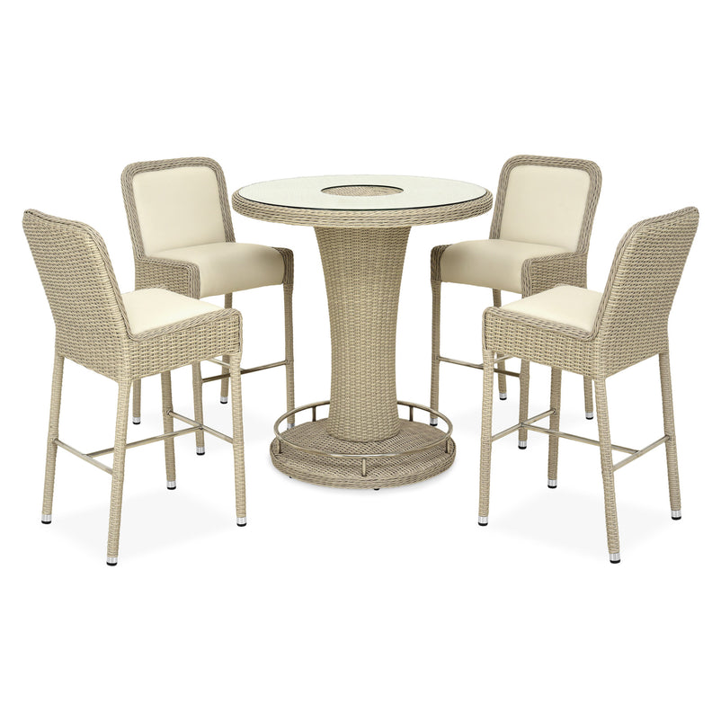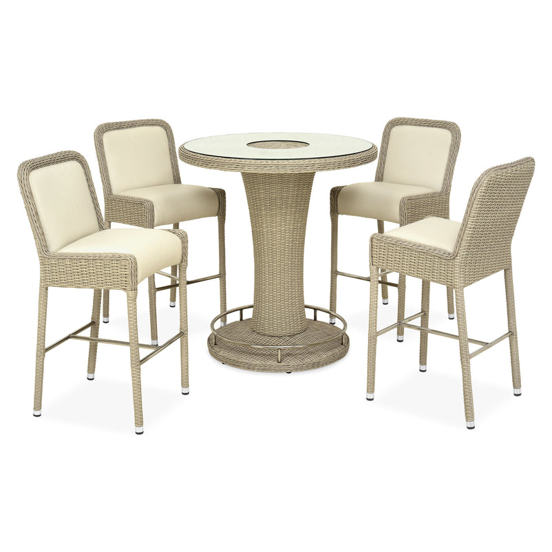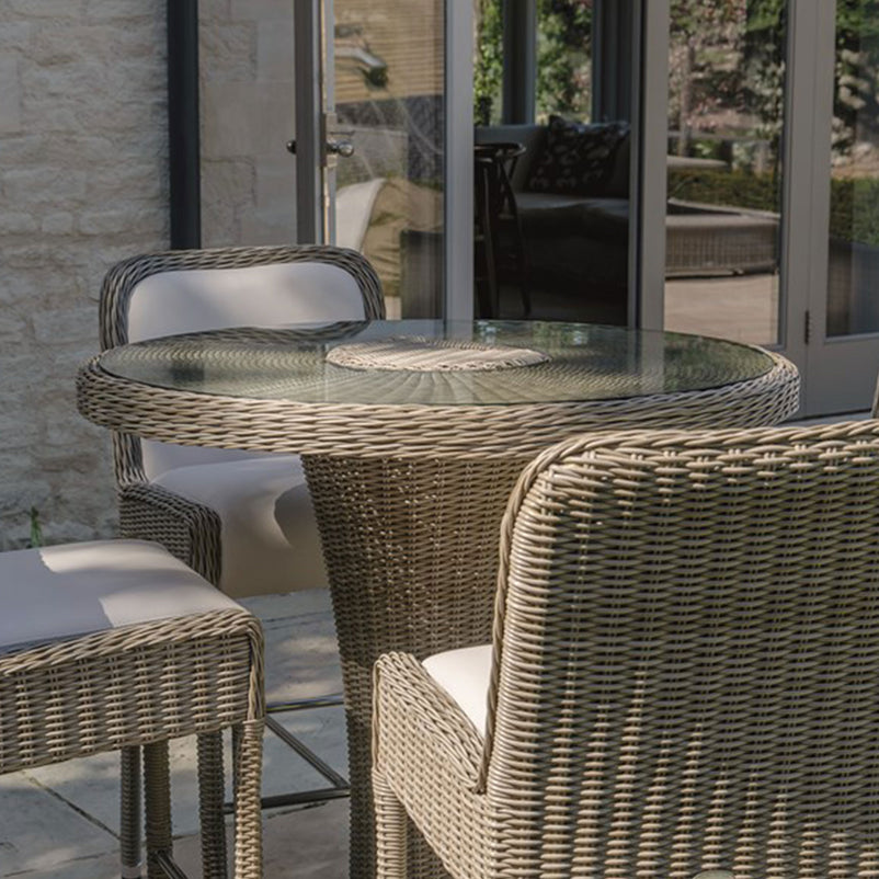 Set mobilier terasă/grădină, 4 scaune bar și masă Erin. Bucurați-vă de o notă de super-yacht chic cu colecția noastră Erin. Cu țesătură luxoasă din piele artificială, care este complet tapițată cu ratan sintetic, astfel încât nu sunt necesare perne. Fabricate cu un cadru din aluminiu vopsit în camp electrostatic, piesele din gama Erin sunt ușoare, durabile și confortabile. Blatul mesei din sticlă este îngropat în împletitura pentru protecție și estetică sporite.