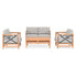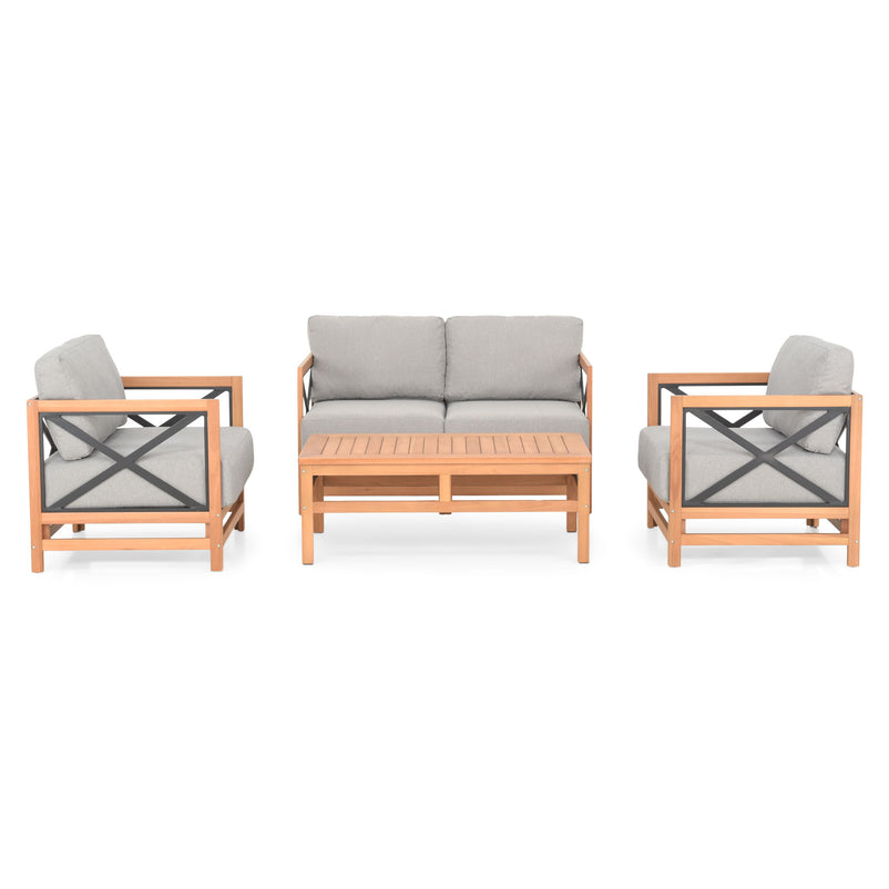 Set mobilier terasă/grădină 2 fotolii, canapea și măsuță Pure. Bucurați-vă de gustările în aer liber și momentele de socializare cu familia ori prietenii, pe durata întregului sezon, mulțumită setului de mobilier pentru terasă și grădină din gama Pure, realizat din structură din lemn de eucalipt și elemente din aluminiu vopsite în câmp electrostatic. Setul include pernele îmbrăcate în țesătură Olefin cu protecție împotriva umezelii și a razelor UV. Măsuța vă oferă prilejul să serviți cafeaua împreună cu cei apropiați într-un cadru cromatic inspirat de natură, în culori calde și primitoare.