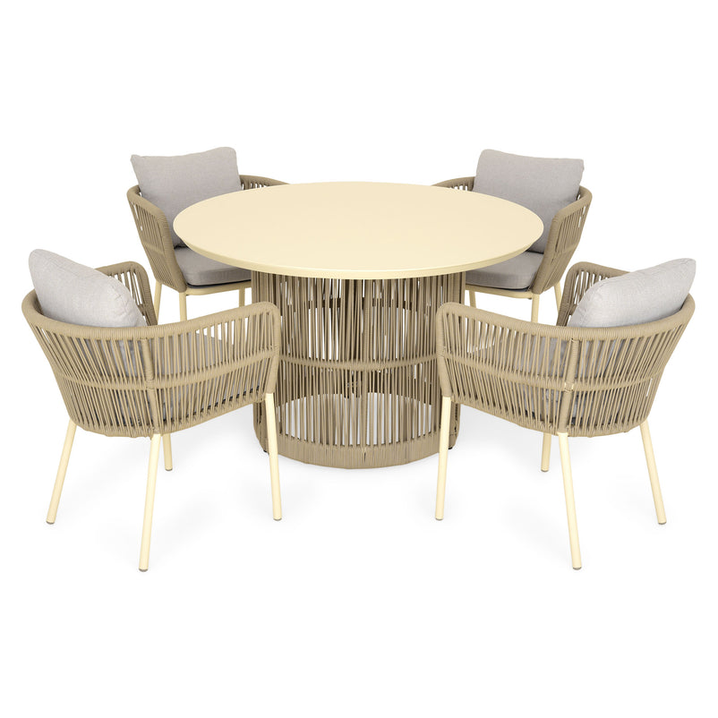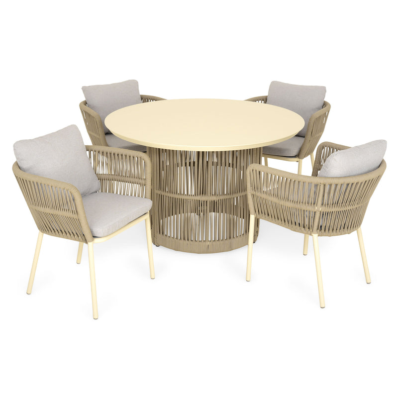 Set mobilier terasă/grădină, set 4 scaune si masă Cliff. Un amestec ideal de potrivire neobișnuită a materialelor și căutarea nesfârșită a unor noi moduri de exprimare, colecția Cliff este sinonimă cu o mare versatilitate. Detaliile, realizate cu frânghii nautice împletite manual și țesături cu protecție împotriva umezelii și a razelor UV, transmit un sentiment de joacă cu o notă super glamour. Nuanțele cromatice combinate se îmbină perfect cu formele rotunjite ale fiecărei piese.