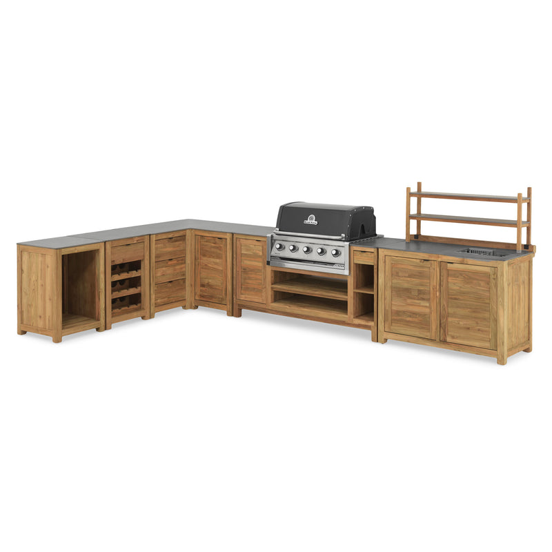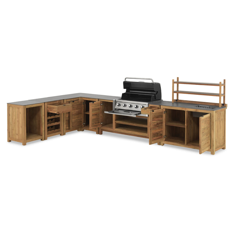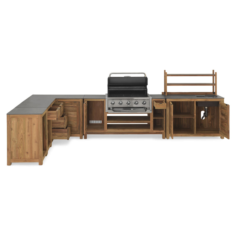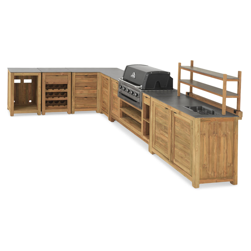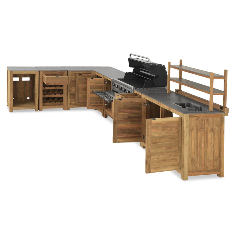 Transformă-ți terasa într-un spațiu complet echipat pentru gătit în aer liber cu bucătăria modulară Country. Realizată din lemn de teak reciclat, rezistent la intemperii și cu un aspect natural, aceasta îmbină designul rustic cu funcționalitatea modernă. Blatul din ceramică oferă durabilitate și un plus de eleganță, fiind ușor de curățat și ideal pentru utilizare la exterior.