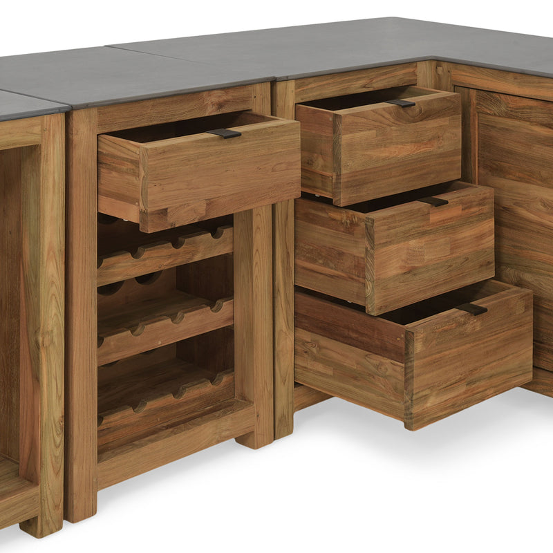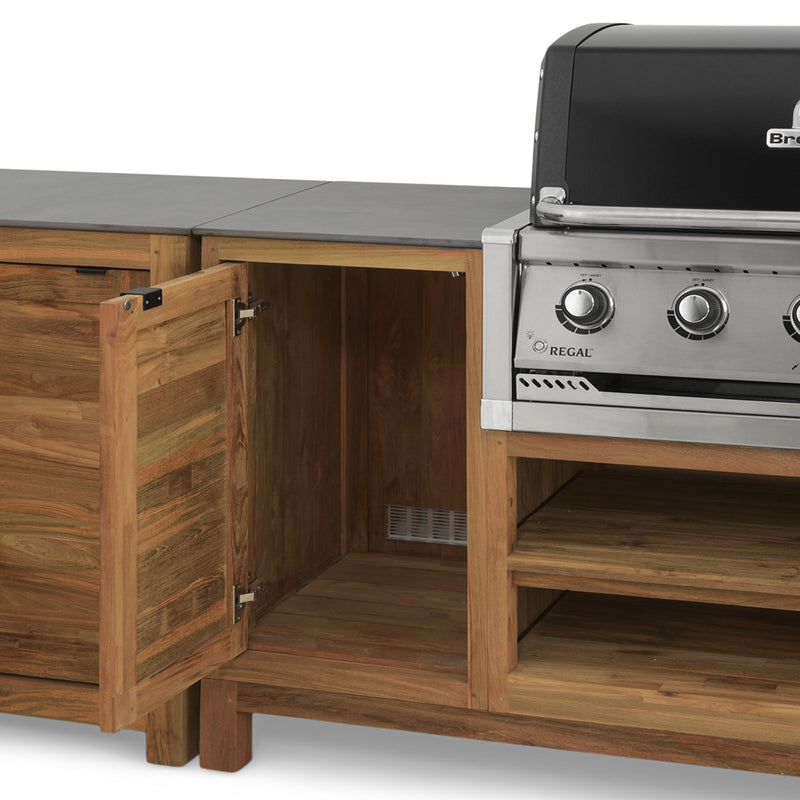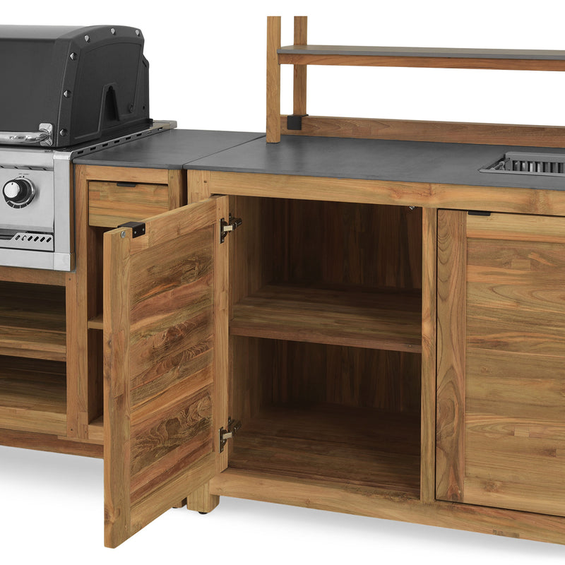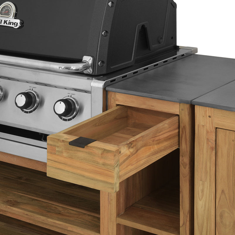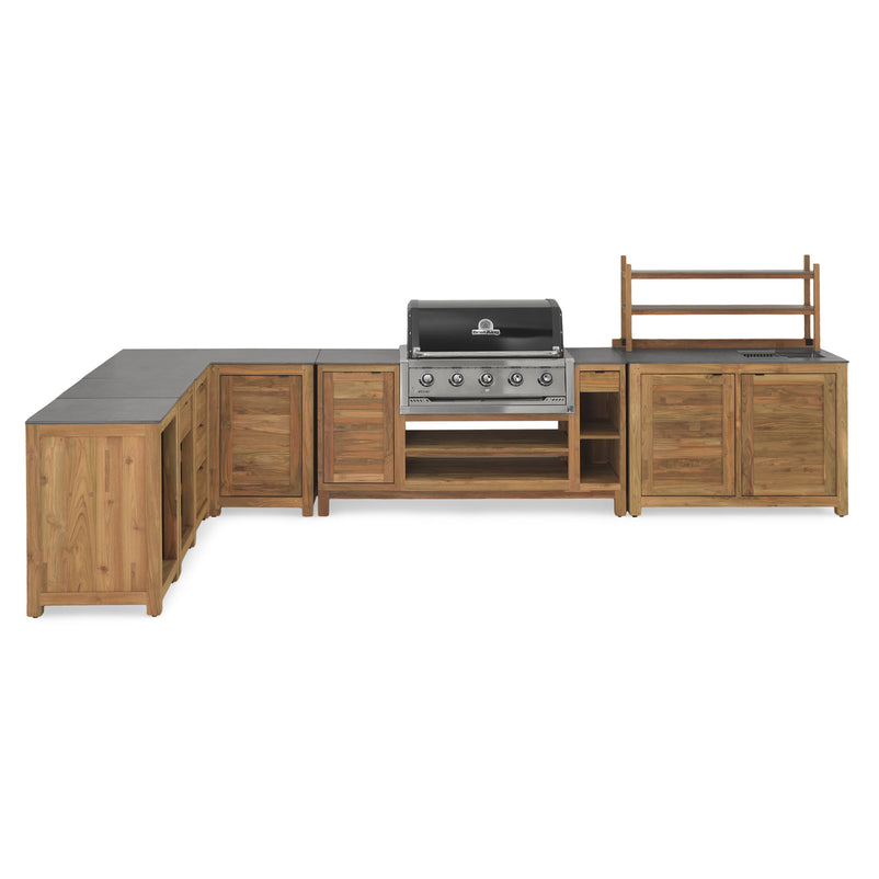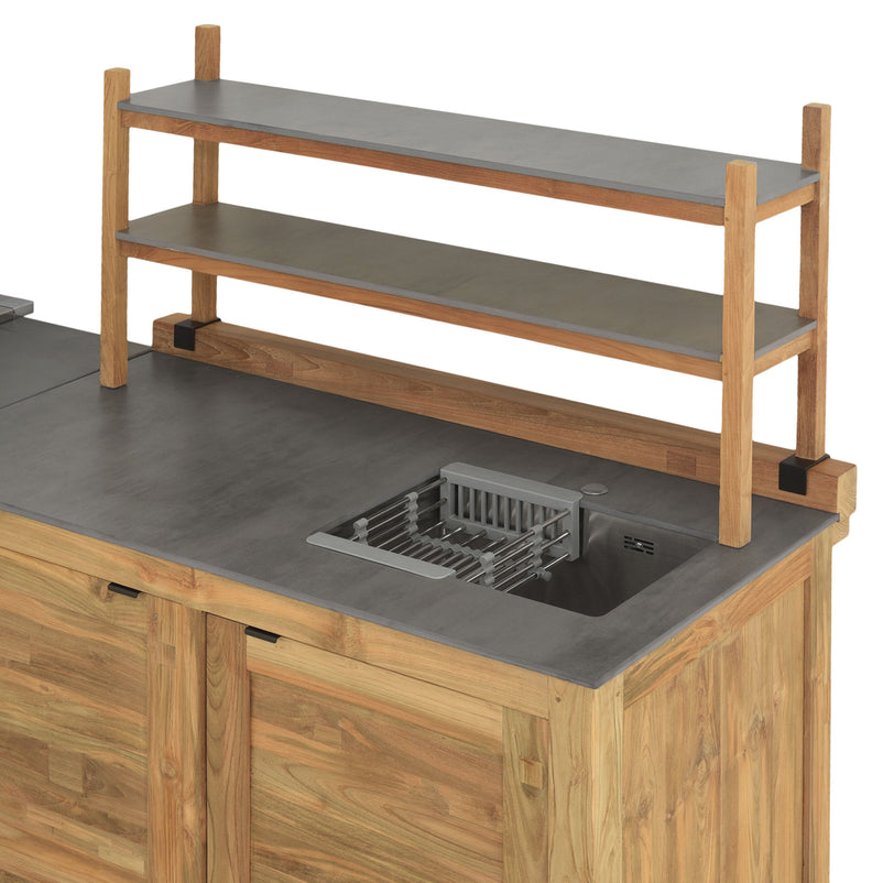 Transformă-ți terasa într-un spațiu complet echipat pentru gătit în aer liber cu bucătăria modulară Country. Realizată din lemn de teak reciclat, rezistent la intemperii și cu un aspect natural, aceasta îmbină designul rustic cu funcționalitatea modernă. Blatul din ceramică oferă durabilitate și un plus de eleganță, fiind ușor de curățat și ideal pentru utilizare la exterior.