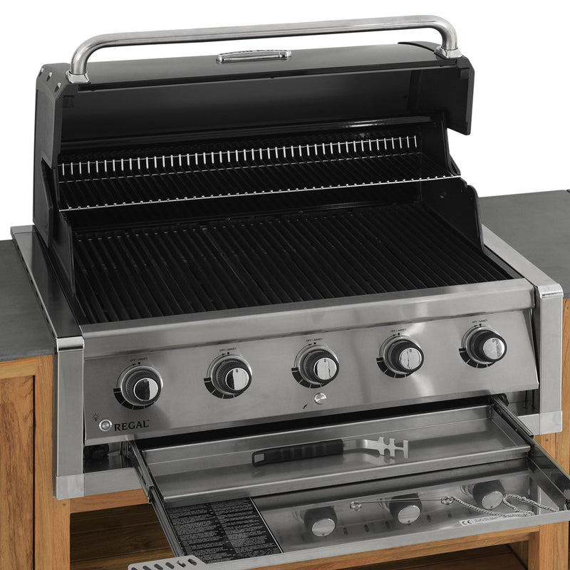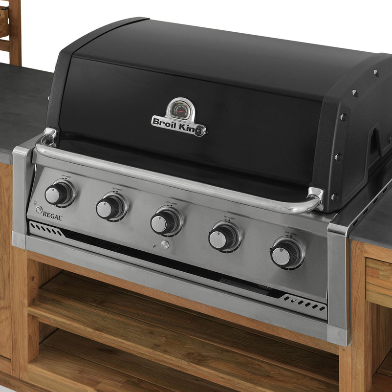 Setul include top grătar încastrat Broil King Regal 520, cu panou emailat negru, capace din aluminiu turnat și cutie de gătit din oțel. Grătarele sunt din fontă Flav-R, cu sistem de gătit Flav-R-Wave din inox. Grătarul dispune de 4 arzătoare Dual-Tube din inox (16 kW), aprindere electronică Sure-Lite și termometru Deluxe Accu-Temp. Suprafața totală de gătit este de 5645 cm², din care 4032 cm² reprezintă zona principală.