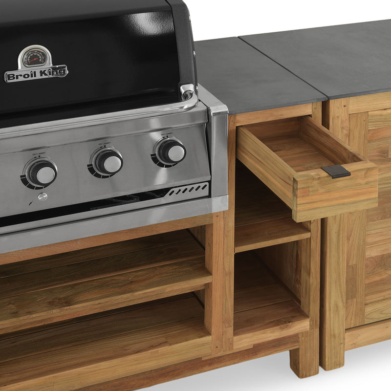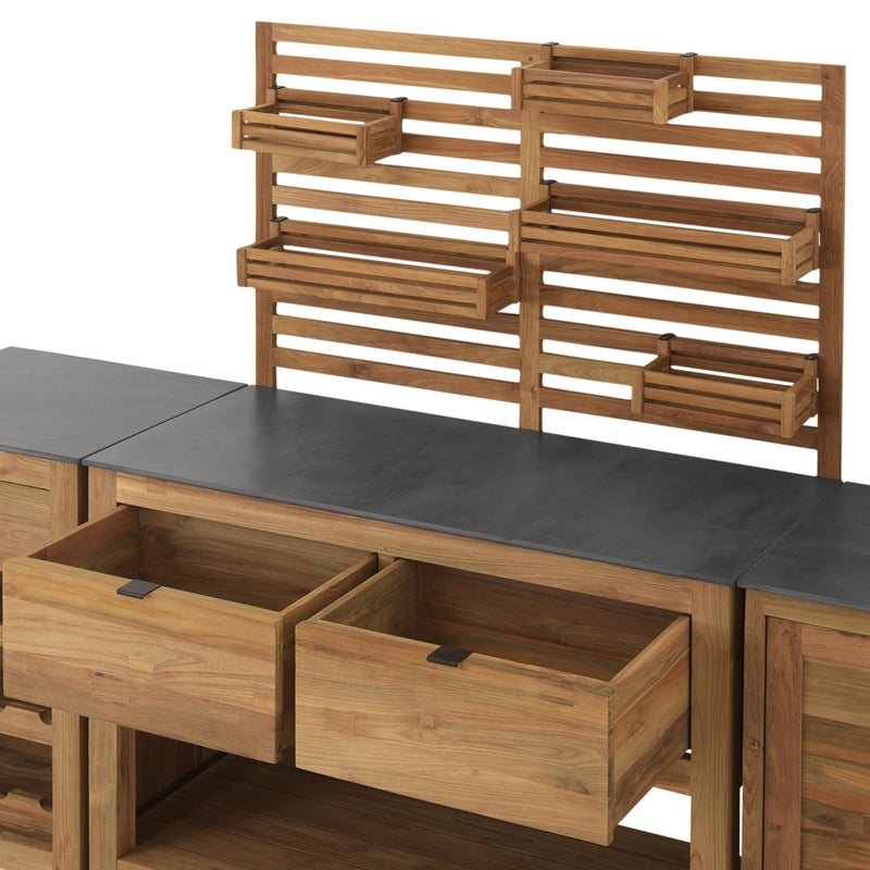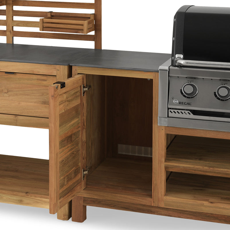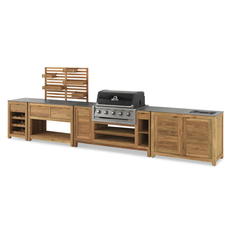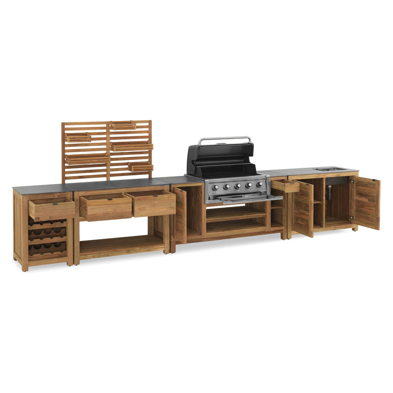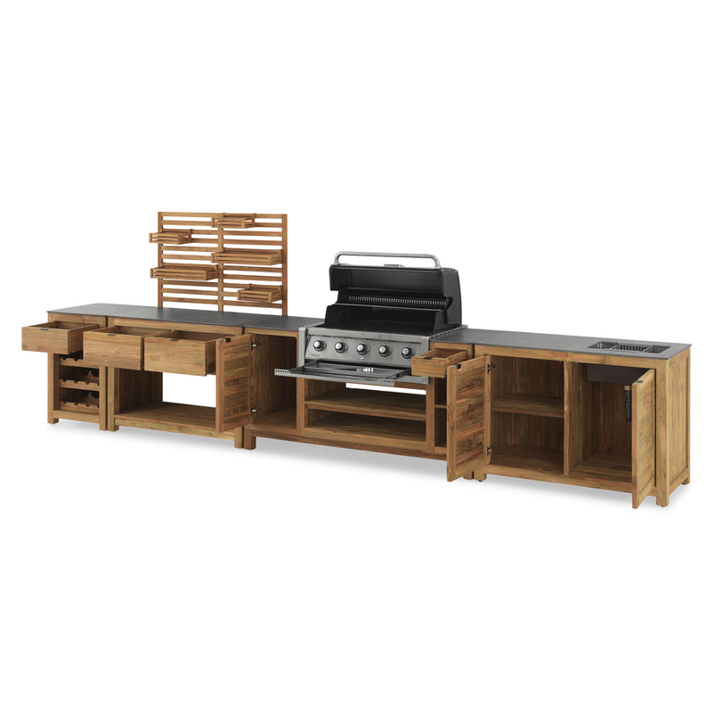 Transformă-ți terasa într-un spațiu complet echipat pentru gătit în aer liber cu bucătăria modulară Country. Realizată din lemn de teak reciclat, rezistent la intemperii și cu un aspect natural, aceasta îmbină designul rustic cu funcționalitatea modernă. Blatul din ceramică oferă durabilitate și un plus de eleganță, fiind ușor de curățat și ideal pentru utilizare la exterior.