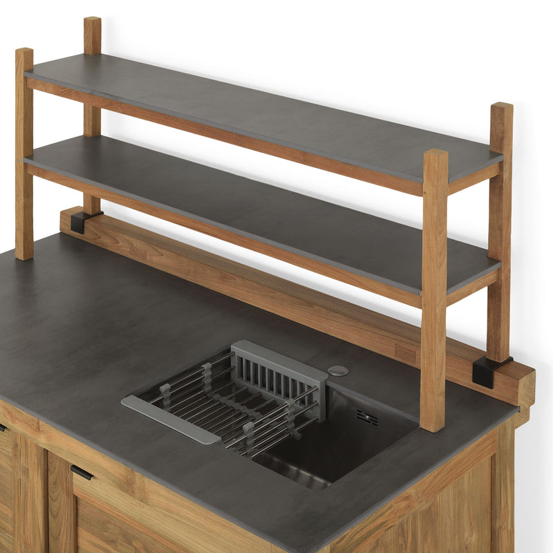 Transformă-ți terasa într-un spațiu complet funcțional cu bucătăria modulară Country, creată special pentru exterior. Realizată din lemn de teak reciclat, rezistent la intemperii și cu un aspect natural autentic, bucătăria combină eleganța rustică cu funcționalitatea modernă. Blatul din ceramică adaugă durabilitate și rafinament, fiind ușor de întreținut și perfect pentru gătit în aer liber. Include chiuvetă din inox și suport veselă. Nu include baterie.