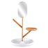 Oglindă machiaj Covo. Atipică la prima vedere, oglinda Covo are un spațiu de depozitare și o puteți amenaja în baie. Structura este fabricată din MDF furniruit combinat cu lemn, ceramica fiind la baza oglinzii. Finisajul în culoarea stejarului, combinat cu alb emană delicatețe și o eleganță cromatică aparte. Integrați în spațiul din baie această oglindă modernă pentru un decor atipic.