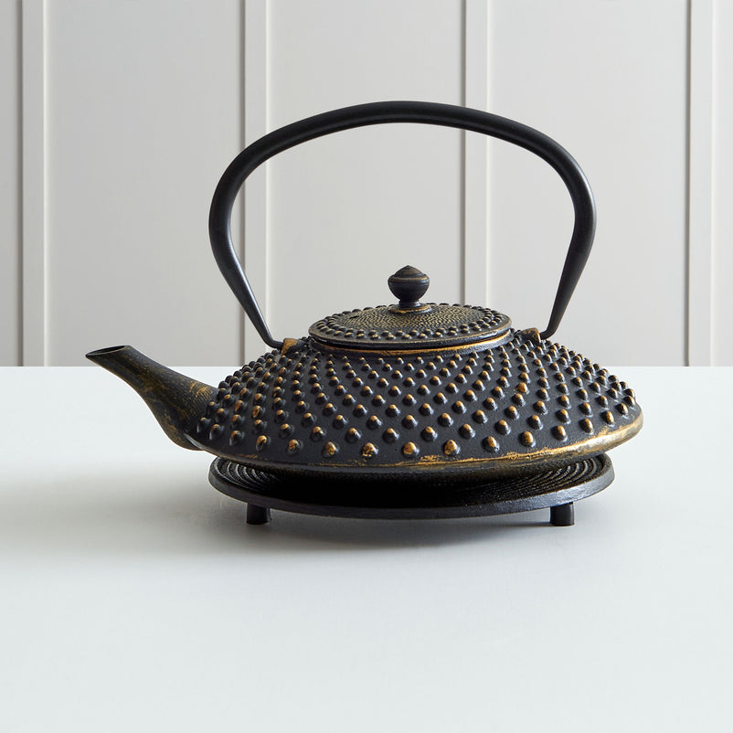 Ceainic cu trivet, fontă Kambin. Caracteristicile fontei: Fonta se caracterizează prin capacitatea sa de a stoca căldura sau frigul mai mult timp. Fonta este un material rezistent în timp. Durata medie de viață a unui ceainic din fontă este de aproximativ 5 ani. Instrucțiuni de folosire: Înainte de prima utilizare, trebuie să clătiți produsul de mai multe ori cu apă călduță și apoi se usucă bine. Fonta nu este potrivită pentru niciun tip de sursă de căldură, se recomandă infuzarea ceaiului în funcție de tipul de ceai. Lăsați produsul încălzit să se răcească înainte de clătirea manuală, evitați fluctuațiile de temperatură (a nu se turna apă rece peste produsul încins).
