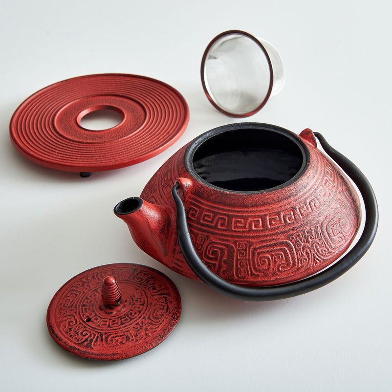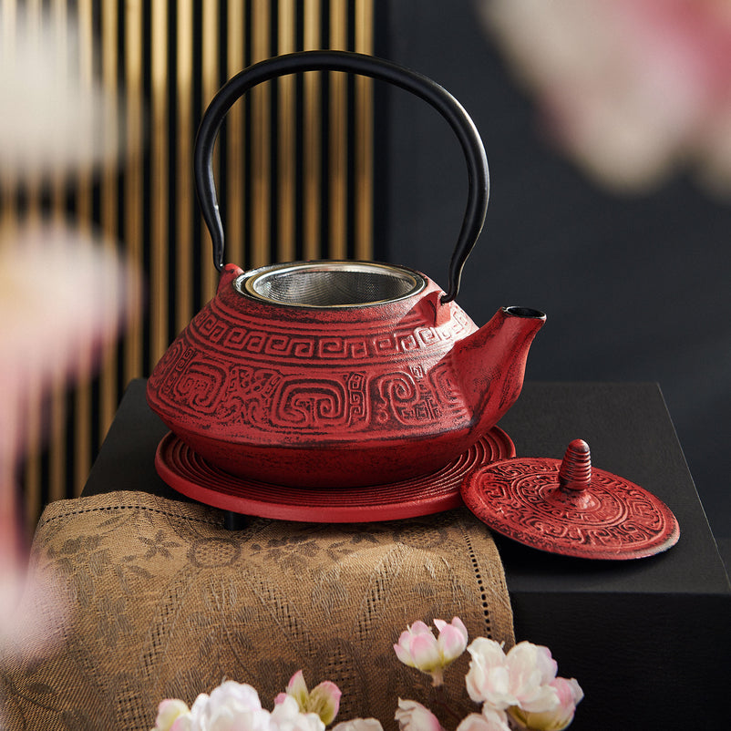Ceainic cu trivet Korai. Caracteristicile fontei: Fonta se caracterizează prin capacitatea sa de a stoca căldura sau frigul mai mult timp. Fonta este un material rezistent în timp. Durata medie de viață a unui ceainic din fonta este de aproximativ 5 ani. Instrucțiuni de folosire: Înainte de prima utilizare, trebuie să clătiți produsul de mai multe ori cu apă călduță și apoi se usucă bine. Fonta nu este potrivită pentru niciun tip de sursă de căldură, se recomandă infuzarea ceaiului în funcție de tipul de ceai. Lăsați produsul încălzit să se răcească înainte de clătirea manuală, evitați fluctuațiile de temperatură (a nu se turna apă rece peste produsul încins).