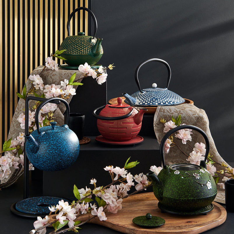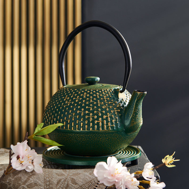 Ceainic cu trivet, fontă Hoshi. Caracteristicile fontei: Fonta se caracterizează prin capacitatea sa de a stoca căldura sau frigul mai mult timp. Fonta este un material rezistent în timp. Durata medie de viață a unui ceainic din fontă este de aproximativ 5 ani. Instrucțiuni de folosire: Înainte de prima utilizare, trebuie să clătiți produsul de mai multe ori cu apă călduță și apoi se usucă bine. Fonta nu este potrivită pentru niciun tip de sursă de căldură, se recomandă infuzarea ceaiului în funcție de tipul de ceai. Lăsați produsul încălzit să se răcească înainte de clătirea manuală, evitați fluctuațiile de temperatură (a nu se turna apă rece peste produsul încins).