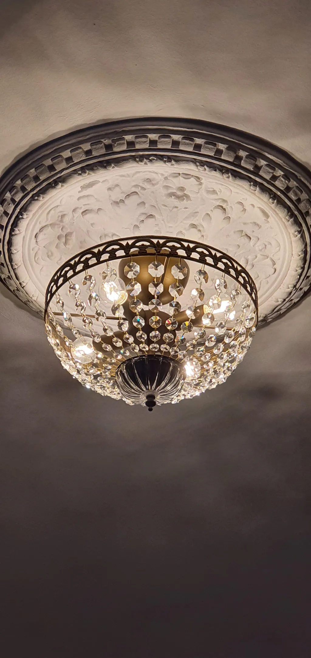 Plafonieră Louise. Plafoniera Louise aduce un plus de strălucire în livingul sau dormitorul vostru. Suportul metalic este completat de o mulțime de franjuri de cristal. Aceștia au atât rol decorativ, cât și funcțional, deoarece contribuie la propagarea uniformă a luminii în încăpere.