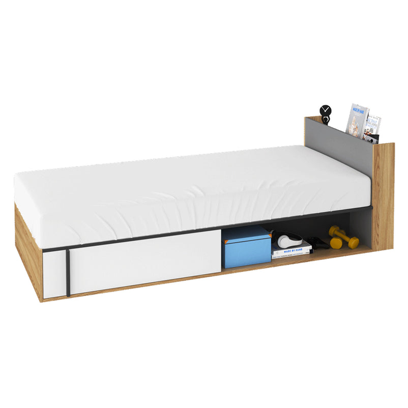 Pat copii, cu sertar, ladă depozitare și saltea incluse Jonas. Patul din gama Jonas este ideal pentru un dormitor în care să predomine stilul jovial, tineresc și modern. Patul va completa perfect camera celui mic și îl va inspira, pentru un plus de creativitate. Patul este foarte practic și util, care vă ajută să organizați lucrurile de care aveți nevoie, iar ordinea să fie mereu menținută. Are somieră rabatabilă cu ladă de depozitare și dispune de saltea cu arcuri Bonnel incluse. În plus, tăblia patului este prevăzută cu o poliță pentru depozitare, o nișă și un sertar pe laterală în partea dreaptă pentru depozitarea obiectelor. Așadar, este o piesă de mobilier deosebit de funcțională, ideală pentru copilul vostru. Latura funcțională e însă devansată de cea estetică, specifică gamei, care surprinde prin stilul modern, nonconformist, urban-chic.