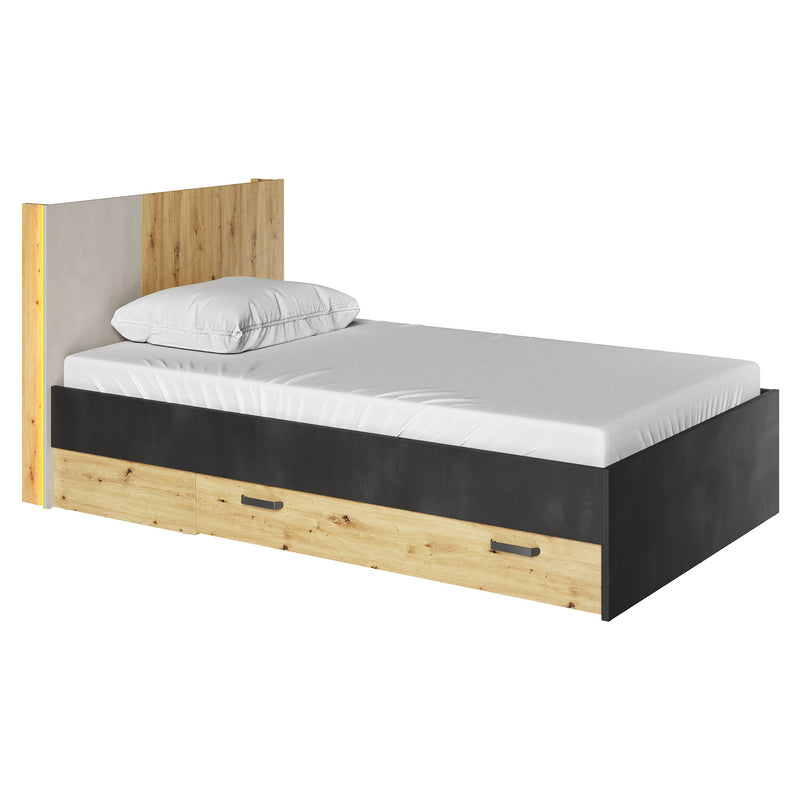 Pat copii cu sertar, somieră și LED-uri incluse Dustin. Piesele de mobilier din gama Dustin sunt destinate unei camere pentru copii, acestea având rolul de a construi un loc potrivit creșterii și dezvoltării acestora. Patul este construit din panouri aglomerate din lemn melaminat cu cant ABS. Acesta are un sertar cu 2 compartimente și este reversibil, el putând fi încărcat cu maxim 10 kg. Mânerele sale sunt metalice și contrastează deosebit cu întreaga structură. De asemenea, include somieră cu lamele din lemn, tetiera înaltă oferind un sprijin confortabil care are un rol funcțional important, acela de a suplini un raft pe care puteți să depozitați obiectele pe care copilul le dorește la îndemână. Raftul are decupaj pentru cablul de încărcător. Totodată, posedă, o bandă de led-uri cu lumină galbenă, care poate suplini rolul veiozei. Oferiți o schimbare camerei copilului cu acest pat multifuncțional, pe care să aibă nopți odihnitoare acasă.