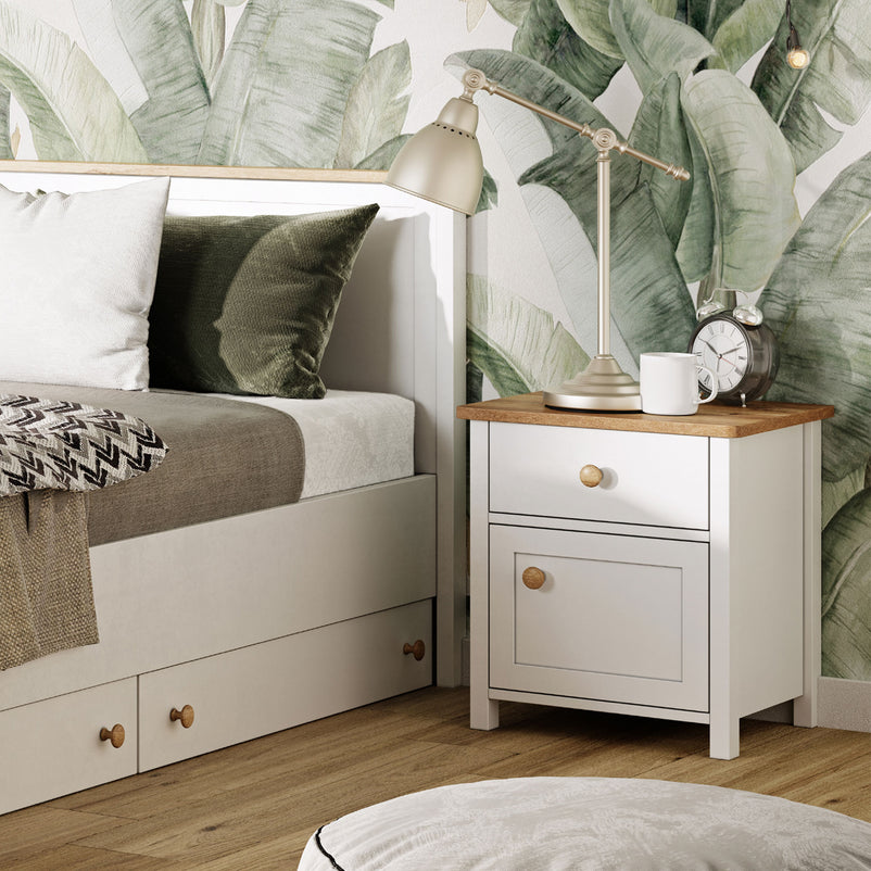 Noptieră copii, 1 ușă Sylvie. Piesele de mobilier ale gamei Sylvie completează camera celor mici pentru ca aceștia să crească și să se dezvolte în cele mai bune condiții. În perioada lor de formare este foarte important ca locul lor cel mai de preț să fie amenajat cât mai elegant, rafinat și deosebit pentru a le dezvolta creativitatea și simțul stilului. Noptiera din gama Sylvie este realizată din panouri aglomerate din lemn cu canturi ABS rezistente. Aceasta include 1sertar și un compartiment cu ușă pentru organizarea obiectelor personale. Mânerele sunt discrete și foarte versatile, sub forma unor butoni rotunzi de plastic de culoarea caldă a mierii.