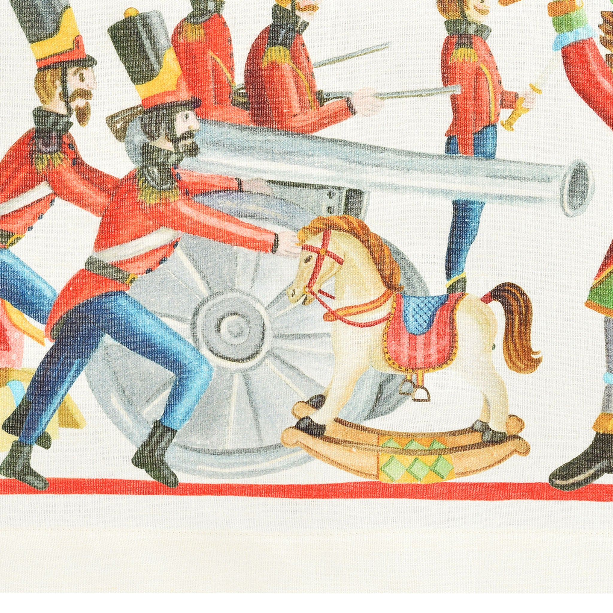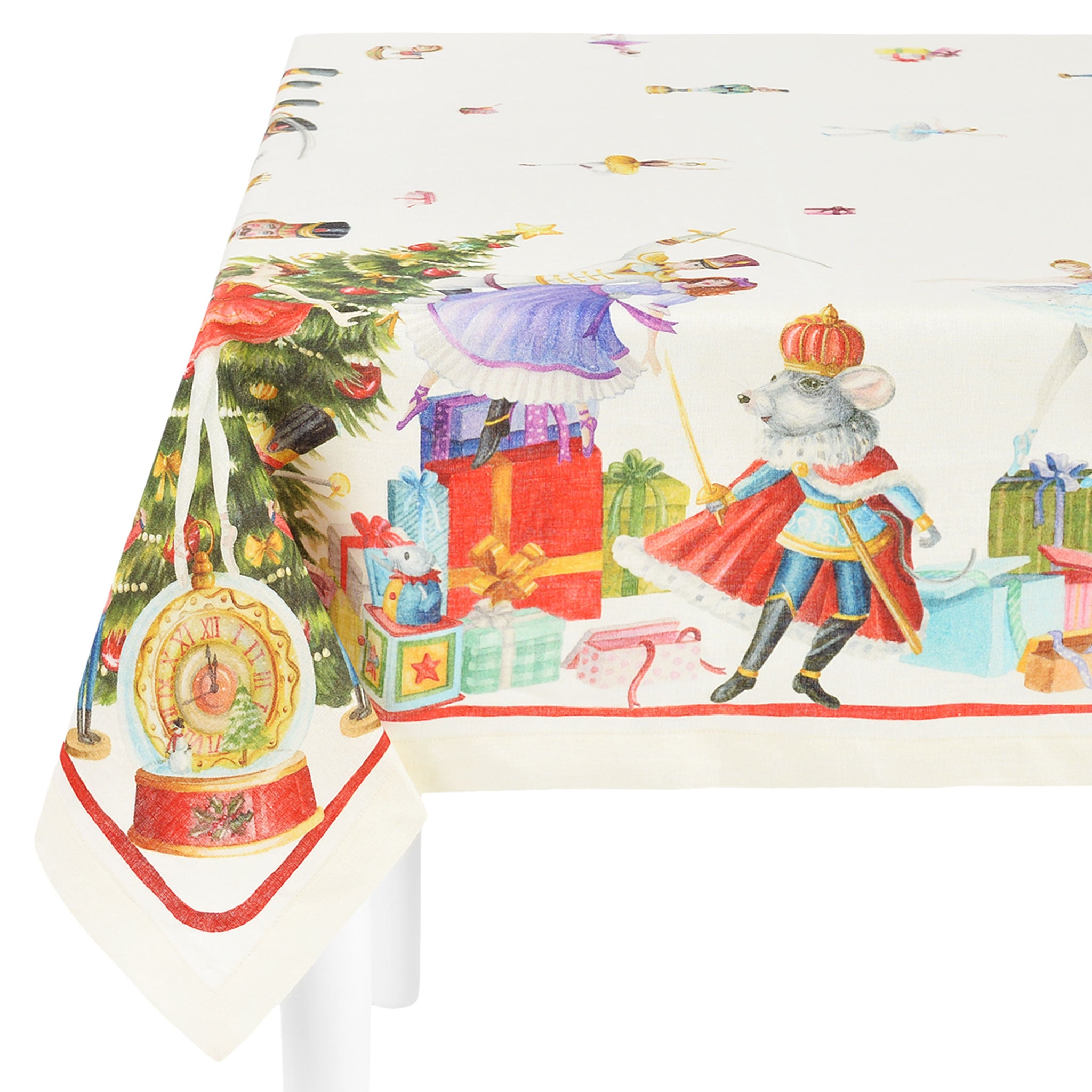 Față de masă pătrată Schiaccianoci. Fața de masă din gama Schiaccianoci este un accesoriu decorativ perfect pentru mesele festive alături de cei dragi. Aceasta are un model deosebit, îmbogățit de motive și personaje specifice Crăciunului, creând un ambient călduros și prietenos pentru momentele speciale. De asemenea, fața de masă este utilă pentru protejarea suprafeței mesei împotriva zgârieturilor.