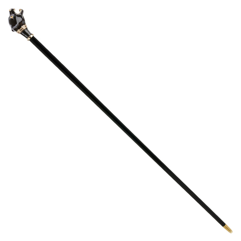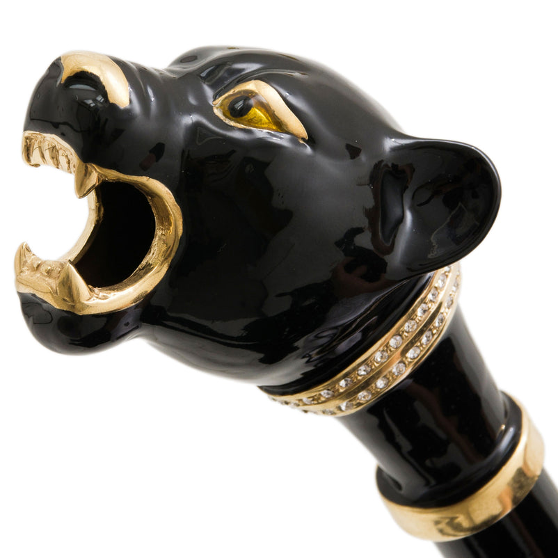 Baston Pantera. Bastonul din gama Pantera poate fi un excelent element decorativ sau un accesoriu cu care puteți să atrageți atenția, perfect pentru o ținută elegantă în cadrul unui eveniment. Acesta emană un aer nonconformist, fiind realizat din lemn cu mâner din alamă emailată decorat cu cristale Swarovski și capăt din alamă și cauciuc. De asemenea, se poate oferi o cutie cadou pentru a dărui acest produs.