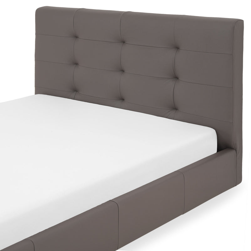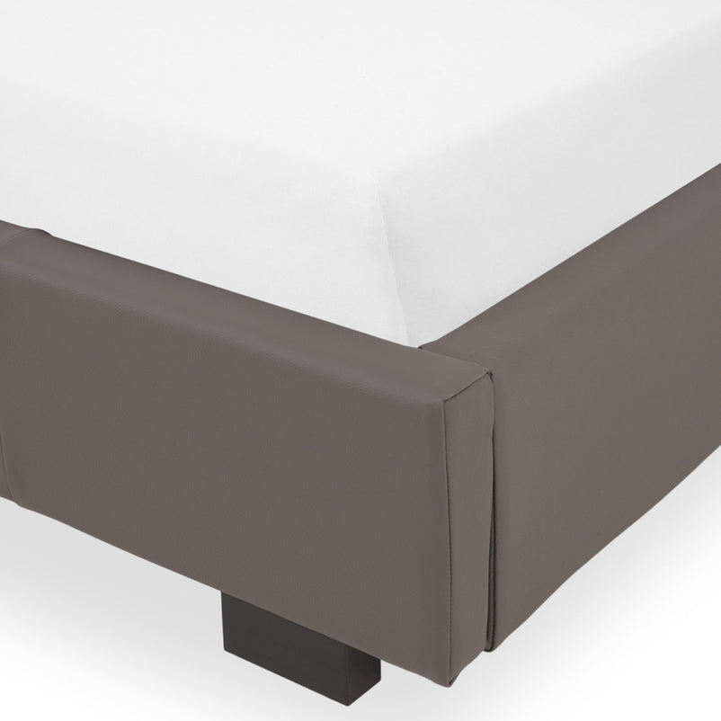 Pat tapițat, somieră inclusă Bruges. Patul Bruges aduce confortul în centrul amenajării din dormitorul vostru. De dimensiuni generoase, patul este tapițat în piele, material rezistent, care îi oferă o estetică deosebită. Pielea are un model modern și o nuanță elegantă. Picioarele de culoare închisă îi asigură stabilitatea, iar somiera inclusă oferă un suport adecvat saltelei.