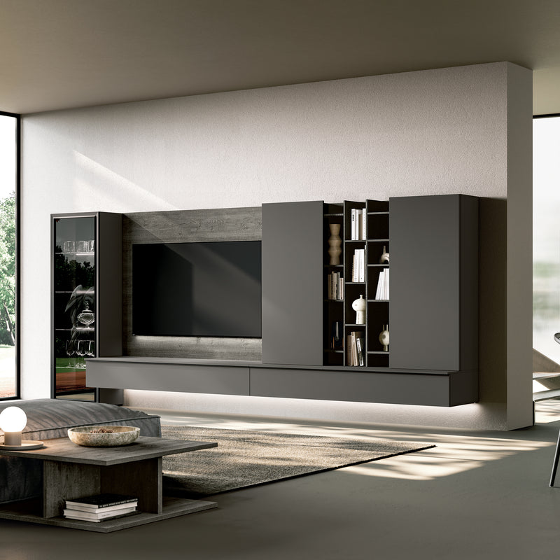 Bibliotecă Metropolis. Polițele de sticlă cu lungimea de 60 cm și bandă LED sunt opționale și se achiziționează separat.