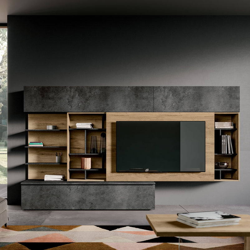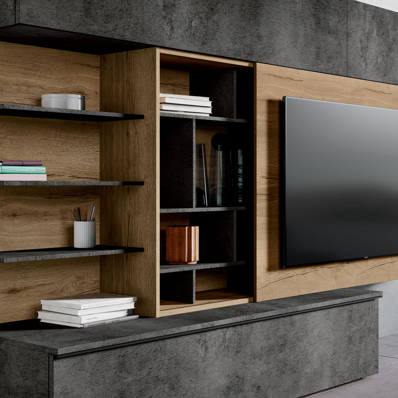 Panoul de susținere TV de L 150x H 96 cm este culisant și se poate deplasa atât în stânga, cât și în dreapta.