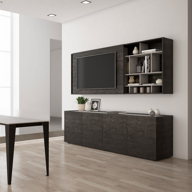 Panoul de susținere TV de L 150x H 96 cm este culisant și se poate deplasa atât în stânga, cât și în dreapta.