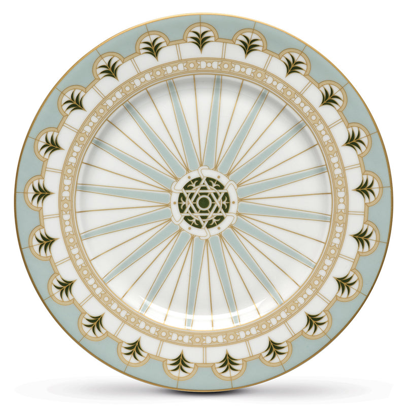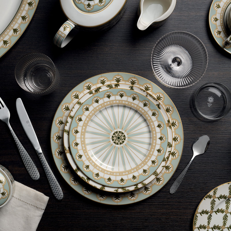 Farfurie aperitiv, porțelan Rosita. Vesela Rosita cu motive geometrice verticale este legată prin elemente naturale decorate cu mici crenguțe de pădure care se luminează în verde și desprind albastrul delicat al liniilor, fiind fabricată din porțelan fin.