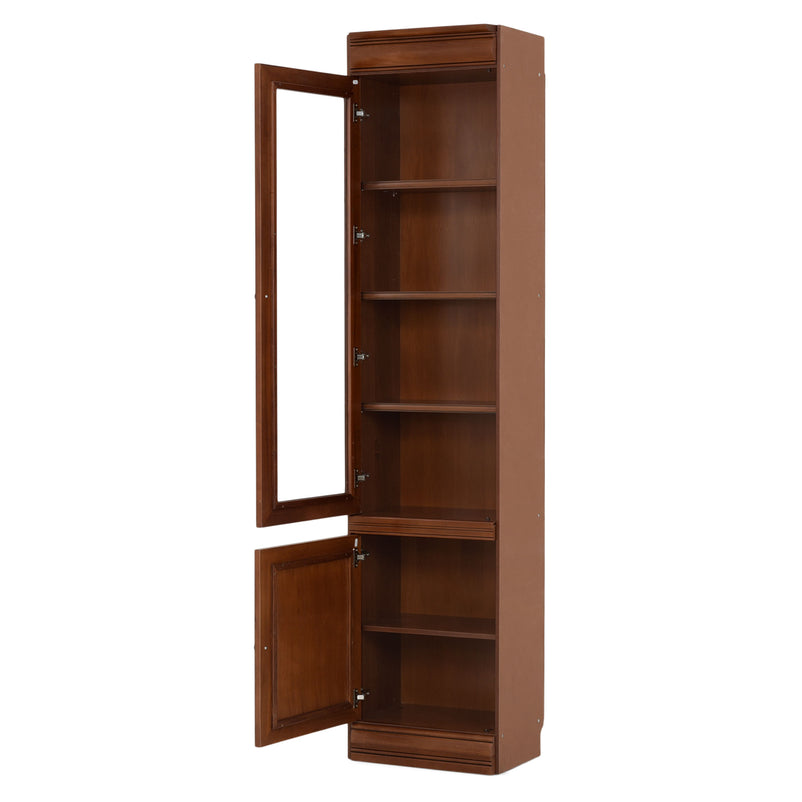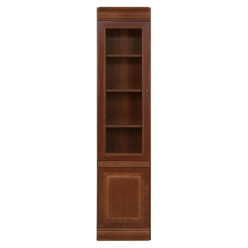 Etajeră îngustă, 1 ușă inferioară, 1 uși sticlă Louis Philippe. Gama Louis Philippe transformă căminul vostru într-o simfonie dedicată clasicului francez. Etajera îngustă din gama Louis Philippe este o piesă de mobilier plină de eleganță, grație elementelor ce o definesc. Aceasta este prevăzută cu 4 polițe spațioase, unde vă puteți depozita diverse obiecte sau decorațiuni. De asemenea, cromatica este deosebită, aducând decorului un aer nobil. Utilizată ca produs independent, etajera necesită achiziționarea unui set de 2 pereți terminali. Într-o compoziție personalizată, cu mai multe etajere, este necesară achiziționarea de pereți intermediari și a unui set de 2 pereți terminali. Setul de pereți terminali are rol de stabilitate și aduce un plus de eleganță prin faptul că soclul și cornișa se continuă și pe lateral. Peretele intermediar are rol de legătură între două etajere, la interiorul ansamblului. Canturile acestuia sunt rotunjite exprimând eleganță și bun gust.