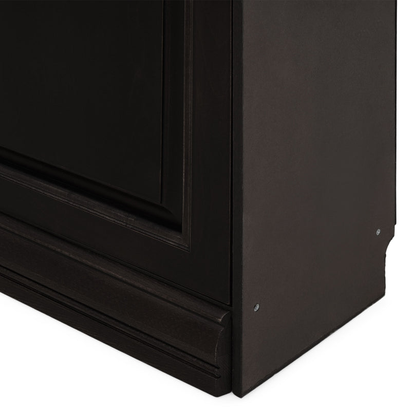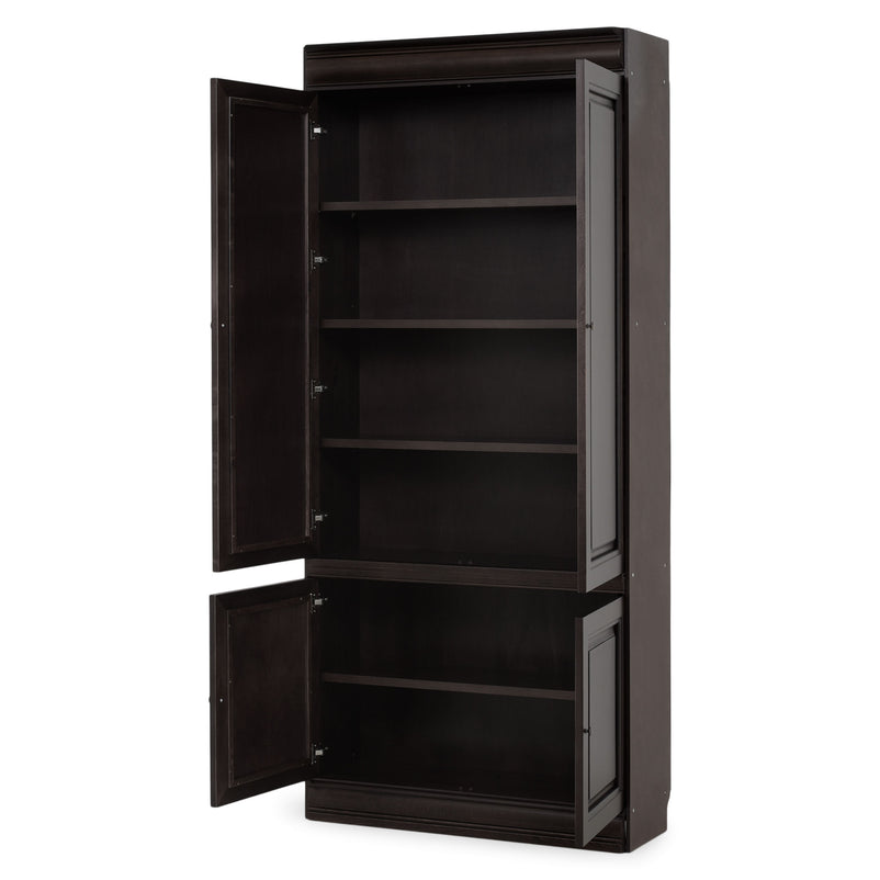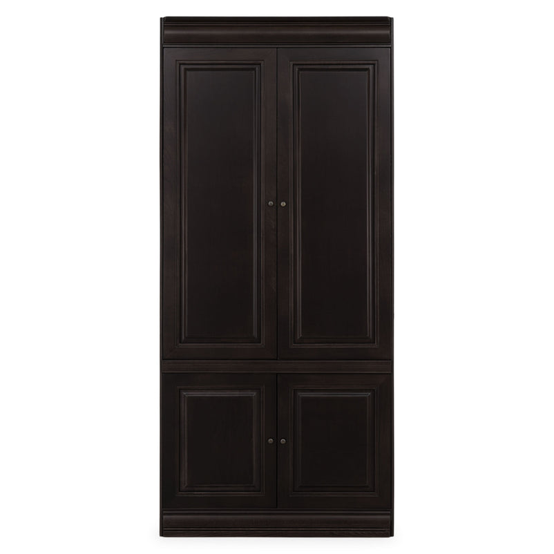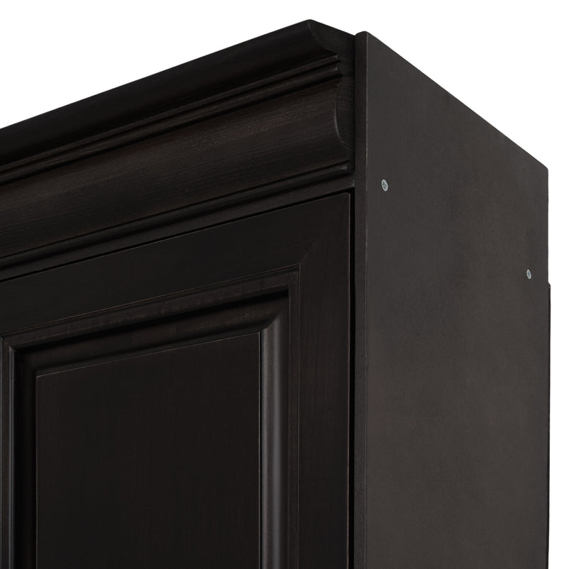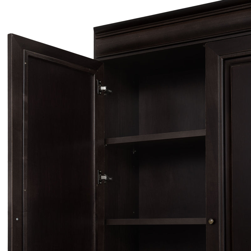 Etajeră lată 4 uși Chocolate. Gama Chocolate se poate integra cu succes în spații pline de eleganță, datorită aspectului său deosebit, accentuând bunul gust al locului. Etajera din gama Chocolate este rezultatul clasicului francez fără vârstă, combinat cu un finisaj aspectuos. Realizată în linii clasice și decorată cu detalii fine, aceasta amenajează o zonă practică și bine organizată datorită rafturilor, care oferă un spațiu generos pentru așezarea diferitelor decorațiuni sau obiecte. Cromatica este sobră, aducând decorului un aer rafinat. Etajera face parte din ansamblul componibil Chocolate. Aceasta poate fi achiziționată independent sau poate fi cuplată cu alte etajere modulare din aceeași gamă, astfel încât să puteți construi propria configurație, în spațiul dorit. Utilizată ca produs independent, etajera necesită achiziționarea unui set de 2 pereți terminali. Într- o compoziție personalizată, cu mai multe etajere, este necesară achiziționarea de pereți intermediari și a unui set de 2 pereți terminali. Setul de pereți terminali are rol de stabilitate și aduce un plus de eleganță prin faptul că soclul și cornișa se continuă și pe lateral. Peretele intermediar are rol de legătură între două etajere, la interiorul ansamblului.