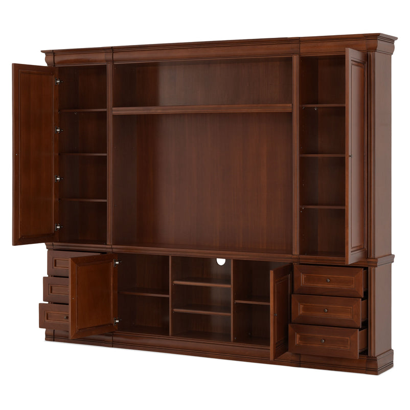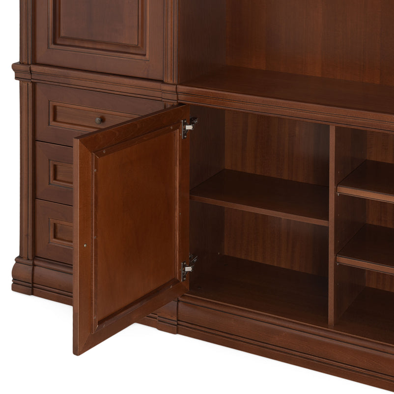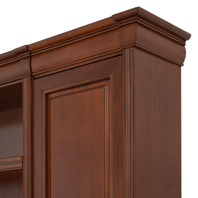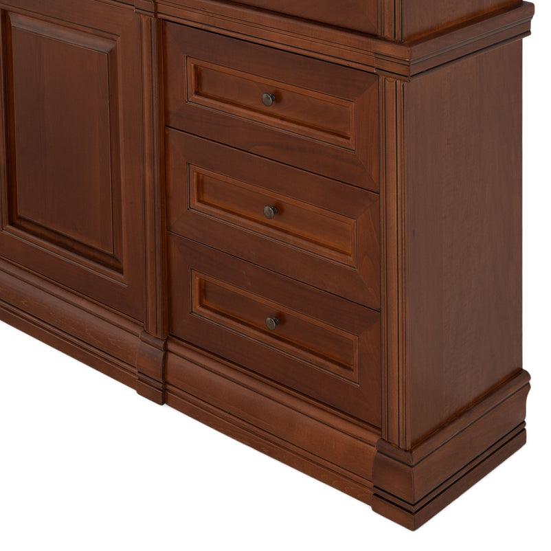 Ansamblu living Louis Philippe. Gama de mobilier Louis Philippe transformă căminul vostru într-o simfonie dedicată clasicului francez. Ansamblul living din gama Louis Philippe este o piesă de mobilier plină de eleganță, grație elementelor ce o definesc. Acesta este prevăzut cu mai multe spații, care vă oferă posibilitatea să vă depozitați lucrurile și obiectele într-un mod organizat și sigur. Ansamblul este realizat din materiale de calitate, finisajul în culoarea cireșului oferindu-i eleganță și stil. De asemenea, cromatica este deosebită, aducând decorului un aer nobil. Utilizată ca produs independent, etajera necesită achiziționarea unui set de 2 pereți terminali. Într-o compoziție personalizată, cu mai multe etajere, este necesară achiziționarea de pereți intermediari și a unui set de 2 pereți terminali. Setul de pereți terminali are rol de stabilitate și aduce un plus de eleganță prin faptul că soclul și cornișa se continuă și pe lateral. Peretele intermediar are rol de legătură între două etajere, la interiorul ansamblului. Canturile acestuia sunt rotunjite exprimând eleganță și bun gust.