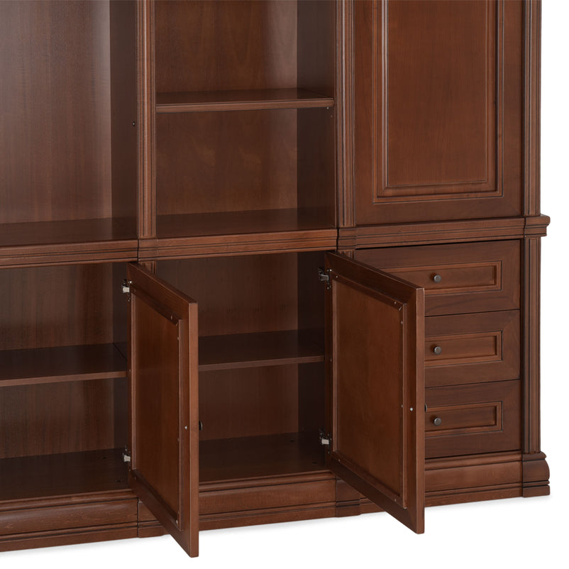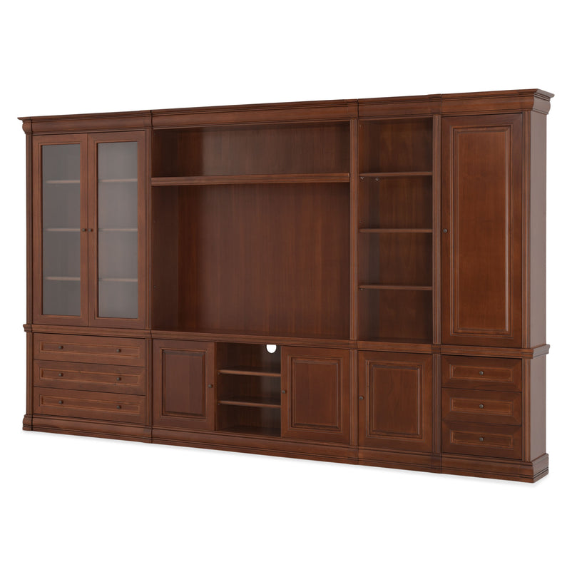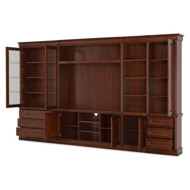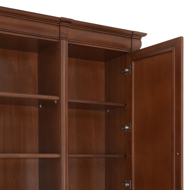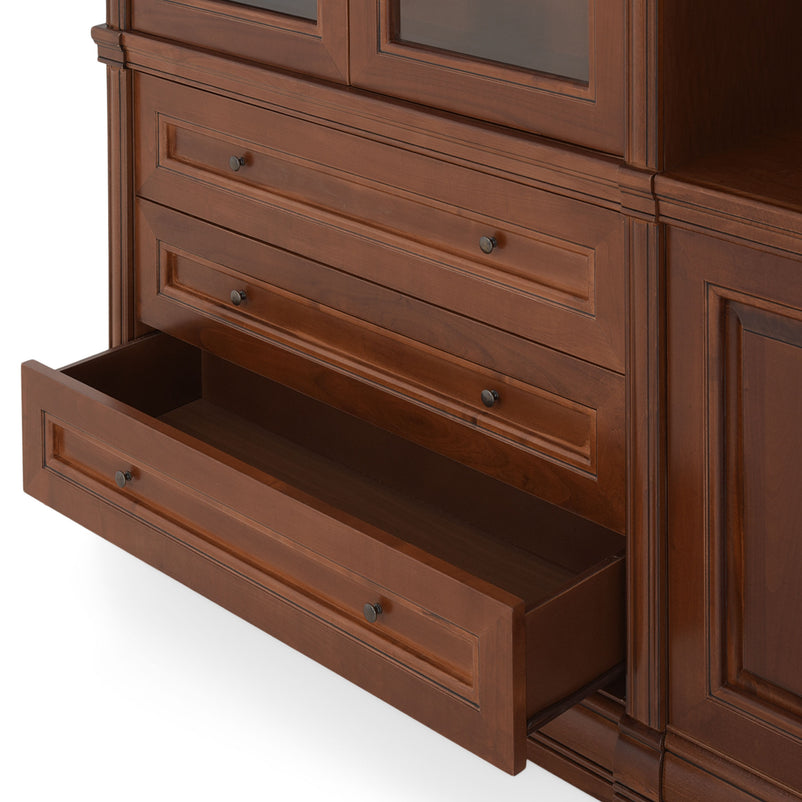 Ansamblu living Louis Philippe. Gama de mobilier Louis Philippe transformă căminul vostru într-o simfonie dedicată clasicului francez. Ansamblul living din gama Louis Philippe este o piesă de mobilier plină de eleganță, grație elementelor ce o definesc. Acesta este prevăzut cu mai multe spații, care vă oferă posibilitatea să vă depozitați lucrurile și obiectele într-un mod organizat și sigur. Ansamblul este realizat din materiale de calitate, finisajul în culoarea cireșului oferindu-i eleganță și stil. De asemenea, cromatica este deosebită, aducând decorului un aer nobil. Utilizată ca produs independent, etajera necesită achiziționarea unui set de 2 pereți terminali. Într-o compoziție personalizată, cu mai multe etajere, este necesară achiziționarea de pereți intermediari și a unui set de 2 pereți terminali. Setul de pereți terminali are rol de stabilitate și aduce un plus de eleganță prin faptul că soclul și cornișa se continuă și pe lateral. Peretele intermediar are rol de legătură între două etajere, la interiorul ansamblului. Canturile acestuia sunt rotunjite exprimând eleganță și bun gust.
