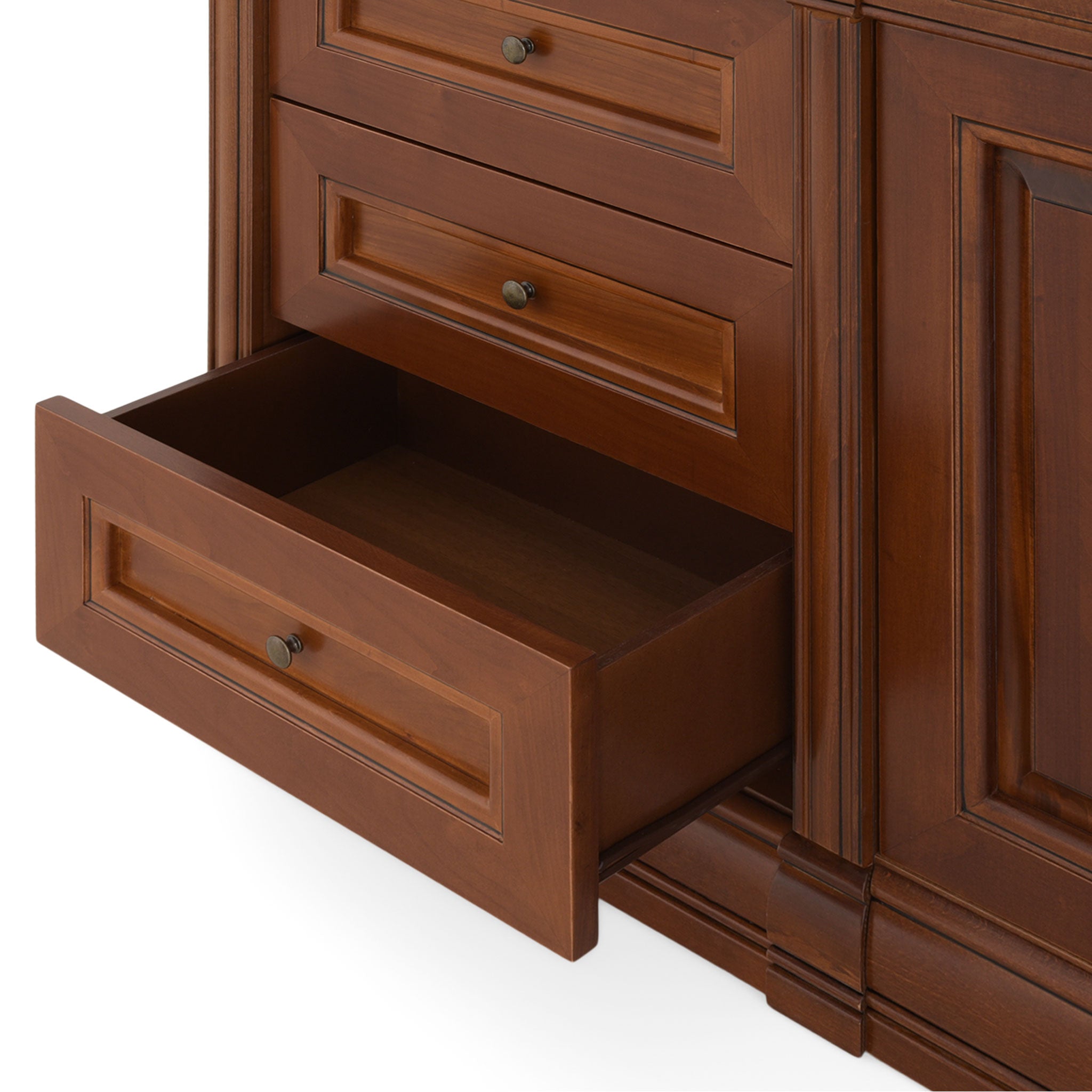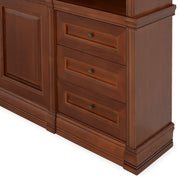 Ansamblu living Louis Philippe. Gama de mobilier Louis Philippe transformă căminul vostru într-o simfonie dedicată clasicului francez. Ansamblul living din gama Louis Philippe este o piesă de mobilier plină de eleganță, grație elementelor ce o definesc. Acesta este prevăzut cu mai multe spații, care vă oferă posibilitatea să vă depozitați lucrurile și obiectele într-un mod organizat și sigur. Ansamblul este realizat din materiale de calitate, finisajul în culoarea cireșului oferindu-i eleganță și stil. De asemenea, cromatica este deosebită, aducând decorului un aer nobil. Utilizată ca produs independent, etajera necesită achiziționarea unui set de 2 pereți terminali. Într-o compoziție personalizată, cu mai multe etajere, este necesară achiziționarea de pereți intermediari și a unui set de 2 pereți terminali. Setul de pereți terminali are rol de stabilitate și aduce un plus de eleganță prin faptul că soclul și cornișa se continuă și pe lateral. Peretele intermediar are rol de legătură între două etajere, la interiorul ansamblului. Canturile acestuia sunt rotunjite exprimând eleganță și bun gust.