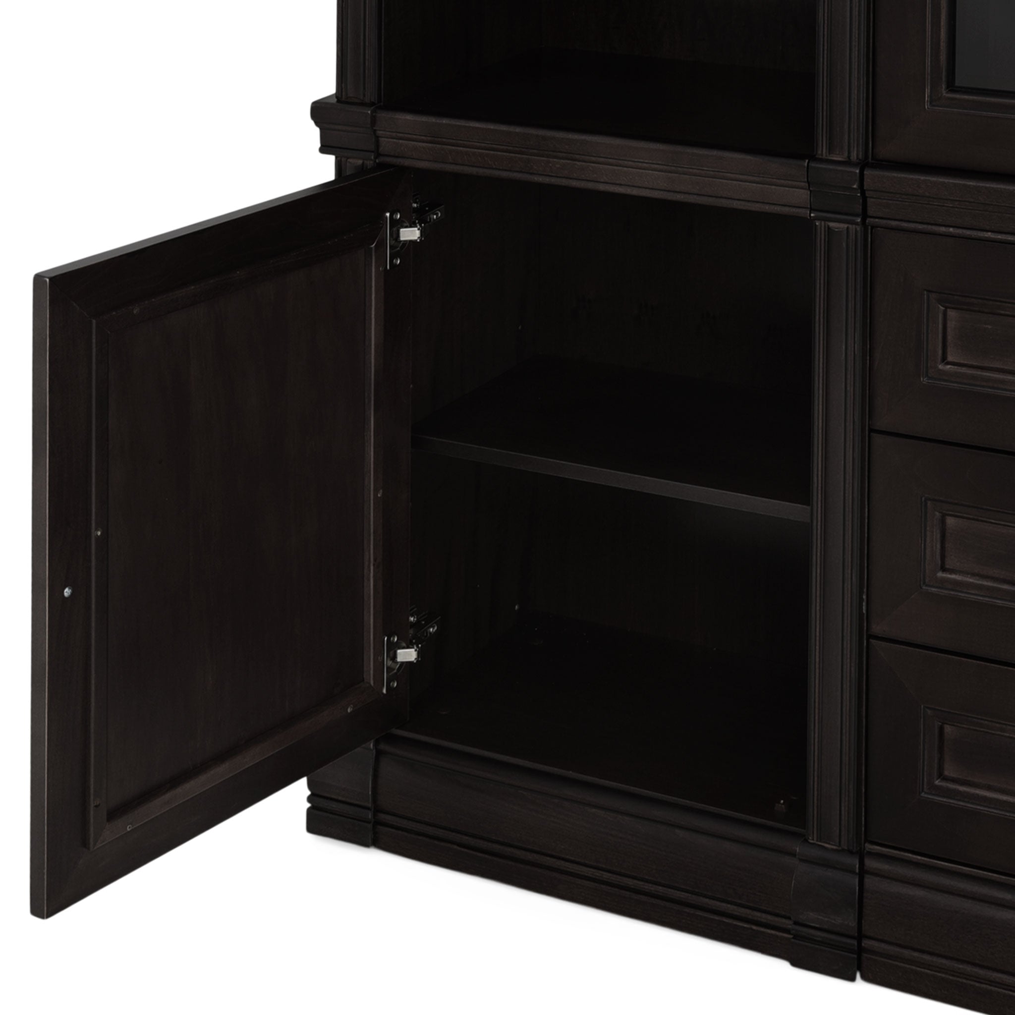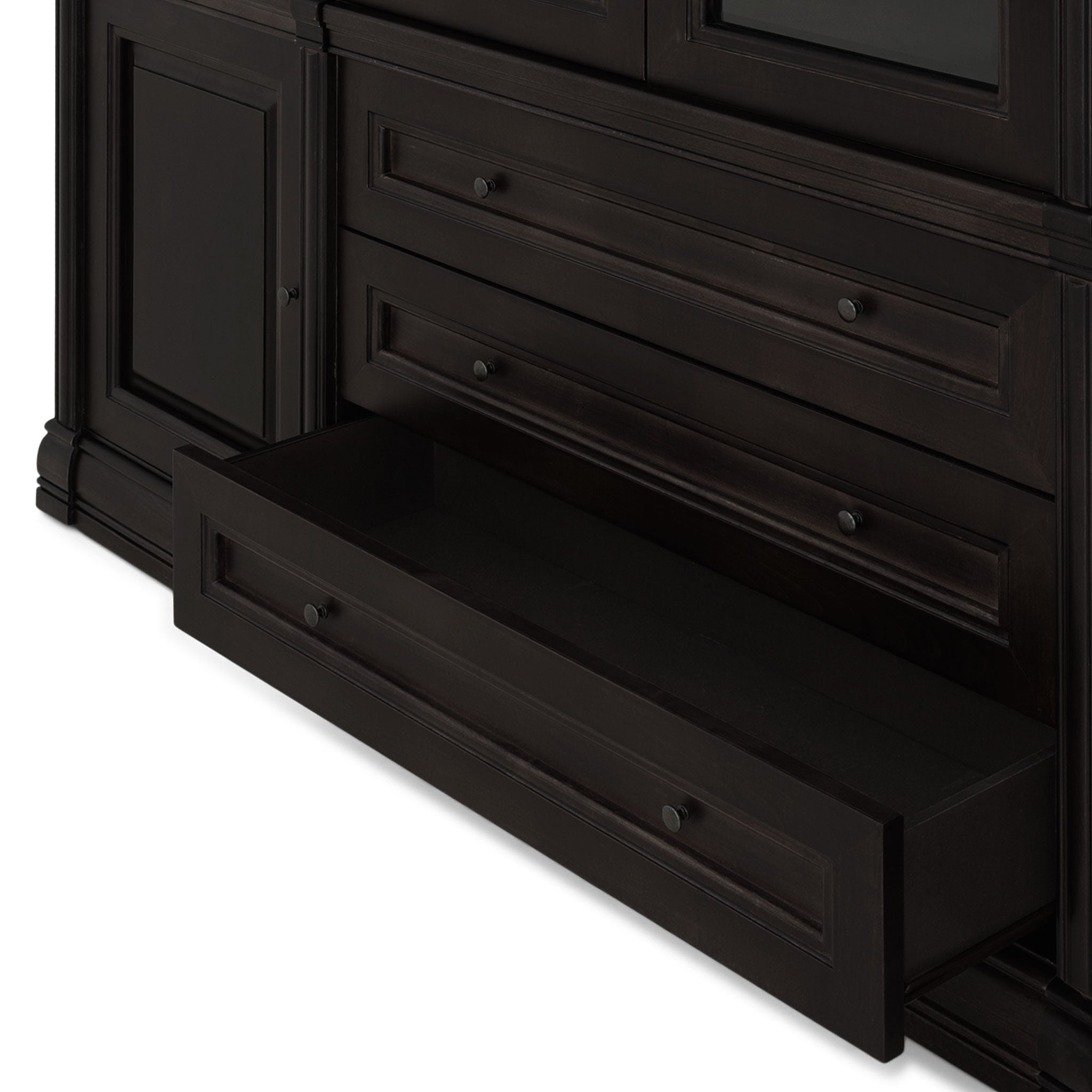 Ansamblu living Chocolate. Gama de mobilier Chocolate relevă sobrietate și eleganță, grație elementelor ce o definesc, rezultând forma clasicului francez fără vârstă. Ansamblul living se potrivește pentru a amenaja o cameră spațioasă. Realizată în linii clasice și decorată cu detalii fine, aceasta amenajează o zonă practică și bine organizată datorită spațiilor de depozitare, care oferă un spațiu generos pentru așezarea diferitelor decorațiuni sau obiecte. Cromatica este sobră, aducând decorului un aer rafinat. Utilizată ca produs independent, etajera necesită achiziționarea unui set de 2 pereți terminali. Într- o compoziție personalizată, cu mai multe etajere, este necesară achiziționarea de pereți intermediari și a unui set de 2 pereți terminali. Setul de pereți terminali are rol de stabilitate și aduce un plus de eleganță prin faptul că soclul și cornișa se continuă și pe lateral. Peretele intermediar are rol de legătură între două etajere, la interiorul ansamblului.