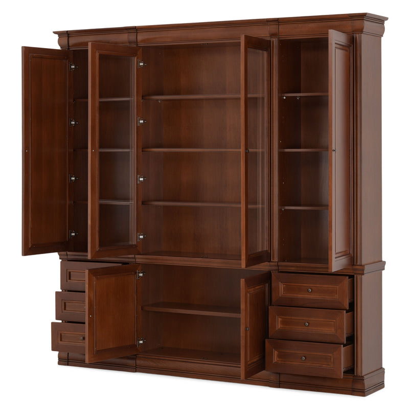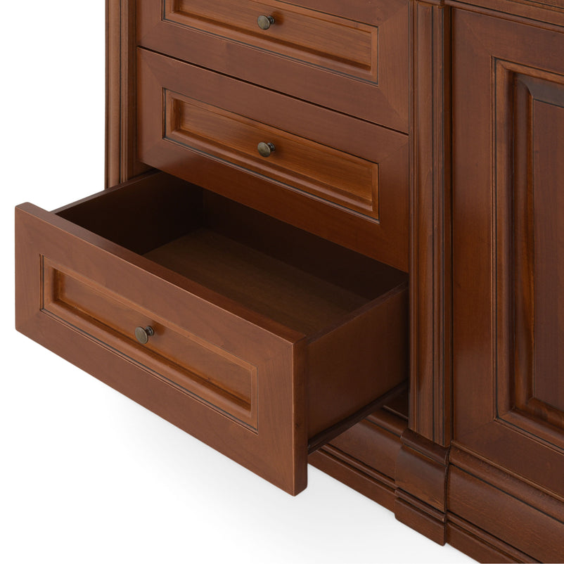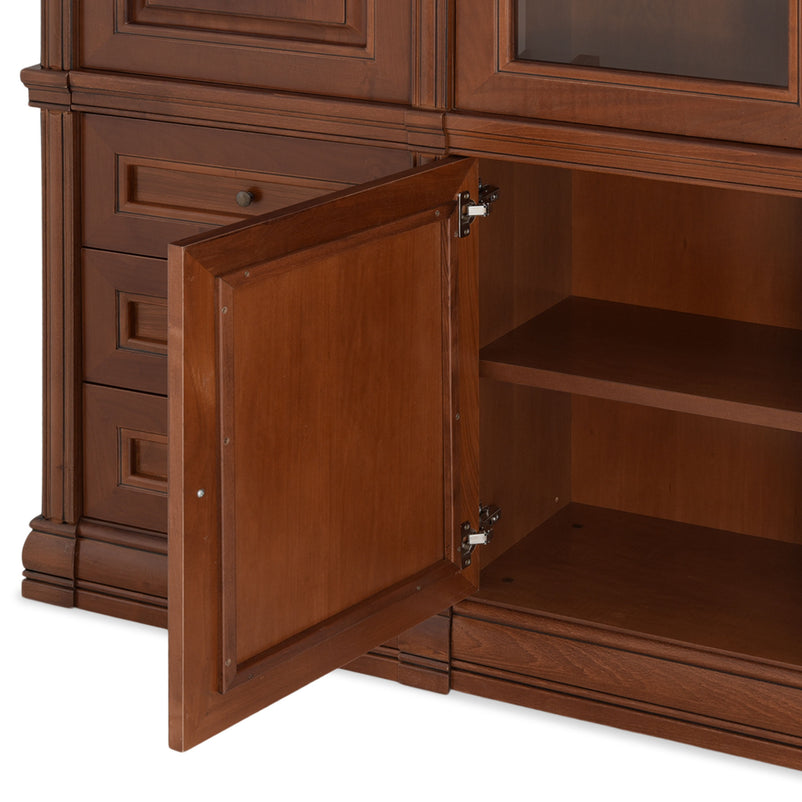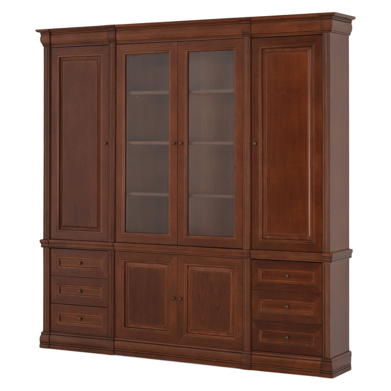 Ansamblu living Louis Philippe. Gama de mobilier Louis Philippe transformă căminul vostru într-o simfonie dedicată clasicului francez. Ansamblul living din gama Louis Philippe este o piesă de mobilier plină de eleganță, grație elementelor ce o definesc. Acesta este prevăzut cu mai multe spații, care vă oferă posibilitatea să vă depozitați lucrurile și obiectele într-un mod organizat și sigur. Ansamblul este realizat din materiale de calitate, finisajul în culoarea cireșului oferindu-i eleganță și stil. De asemenea, cromatica este deosebită, aducând decorului un aer nobil. Utilizată ca produs independent, etajera necesită achiziționarea unui set de 2 pereți terminali. Într-o compoziție personalizată, cu mai multe etajere, este necesară achiziționarea de pereți intermediari și a unui set de 2 pereți terminali. Setul de pereți terminali are rol de stabilitate și aduce un plus de eleganță prin faptul că soclul și cornișa se continuă și pe lateral. Peretele intermediar are rol de legătură între două etajere, la interiorul ansamblului. Canturile acestuia sunt rotunjite exprimând eleganță și bun gust.