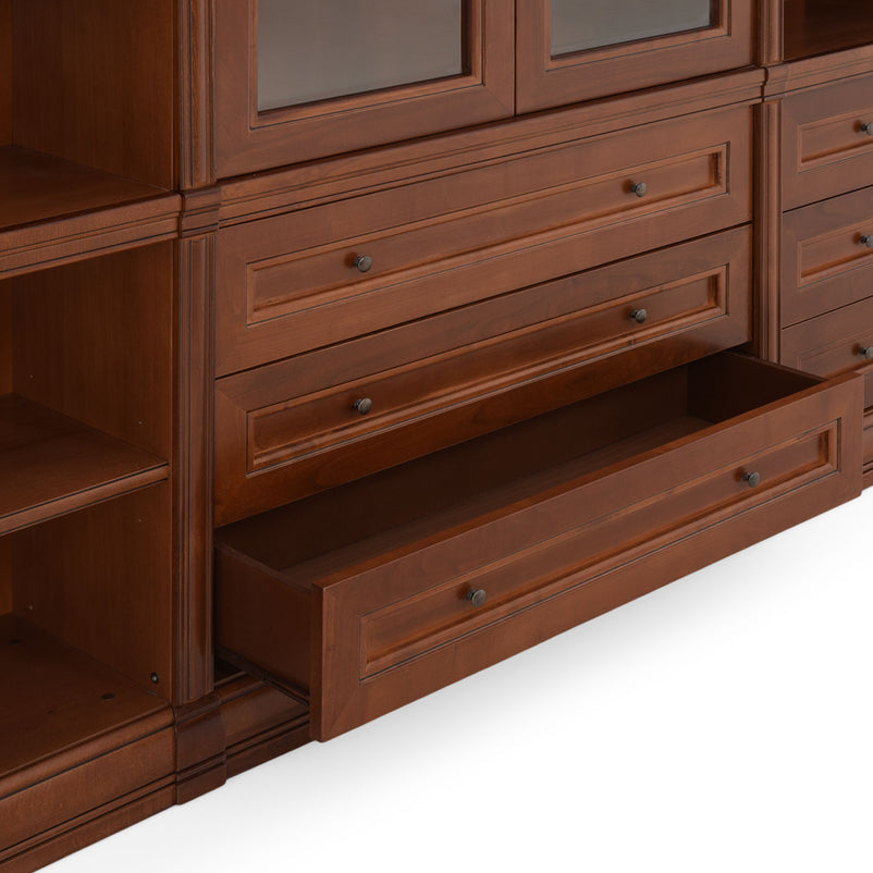 - 1x etajeră lată, 3 sertare, 2 uși sticlă: L. 103 x l. 34 x H. 230 cm.