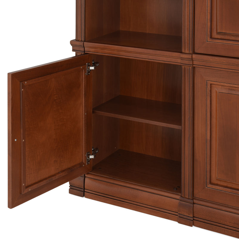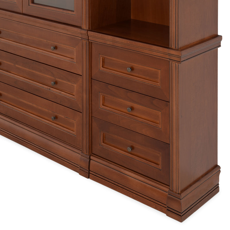 Ansamblu living Louis Philippe. Gama de mobilier Louis Philippe transformă căminul vostru într-o simfonie dedicată clasicului francez. Ansamblul living din gama Louis Philippe este o piesă de mobilier plină de eleganță, grație elementelor ce o definesc. Acesta este prevăzut cu mai multe spații, care vă oferă posibilitatea să vă depozitați lucrurile și obiectele într-un mod organizat și sigur. Ansamblul este realizat din lemn masiv, MDF și panouri aglomerate din lemn, finisajul în culoarea cireșului oferindu-i eleganță și stil. De asemenea, cromatica este deosebită, aducând decorului un aer nobil. Utilizată ca produs independent, etajera necesită achiziționarea unui set de 2 pereți terminali. Într-o compoziție personalizată, cu mai multe etajere, este necesară achiziționarea de pereți intermediari și a unui set de 2 pereți terminali. Setul de pereți terminali are rol de stabilitate și aduce un plus de eleganță prin faptul că soclul și cornișa se continuă și pe lateral. Peretele intermediar are rol de legătură între două etajere, la interiorul ansamblului. Canturile acestuia sunt rotunjite exprimând eleganță și bun gust.